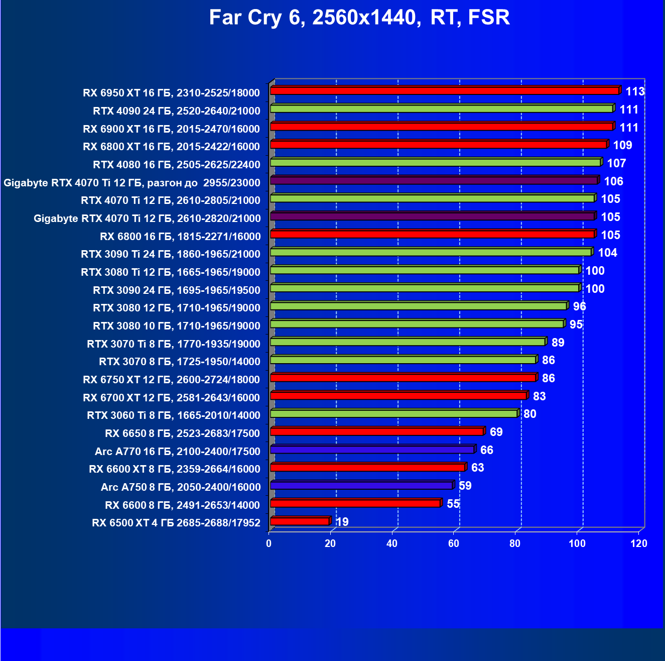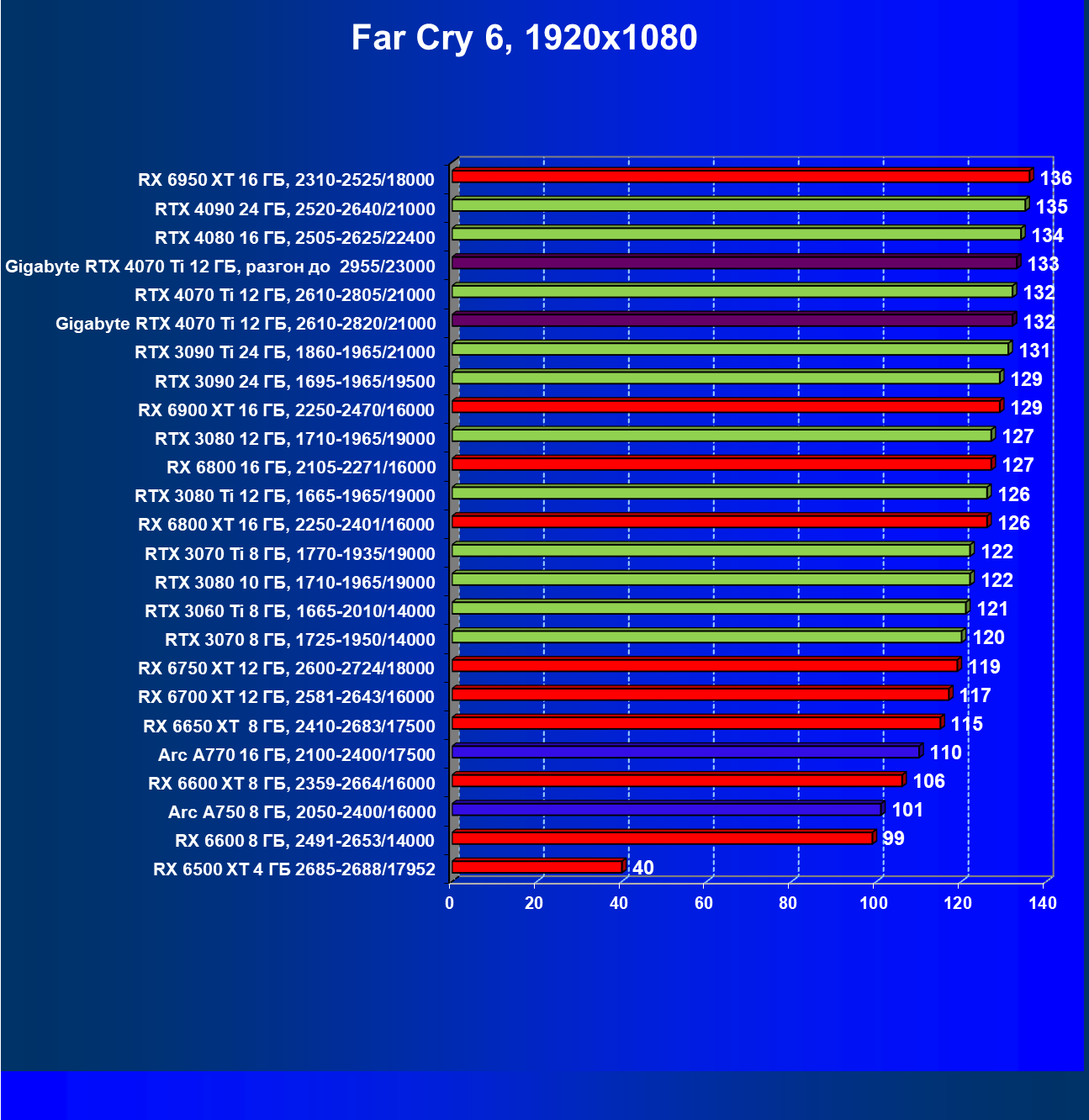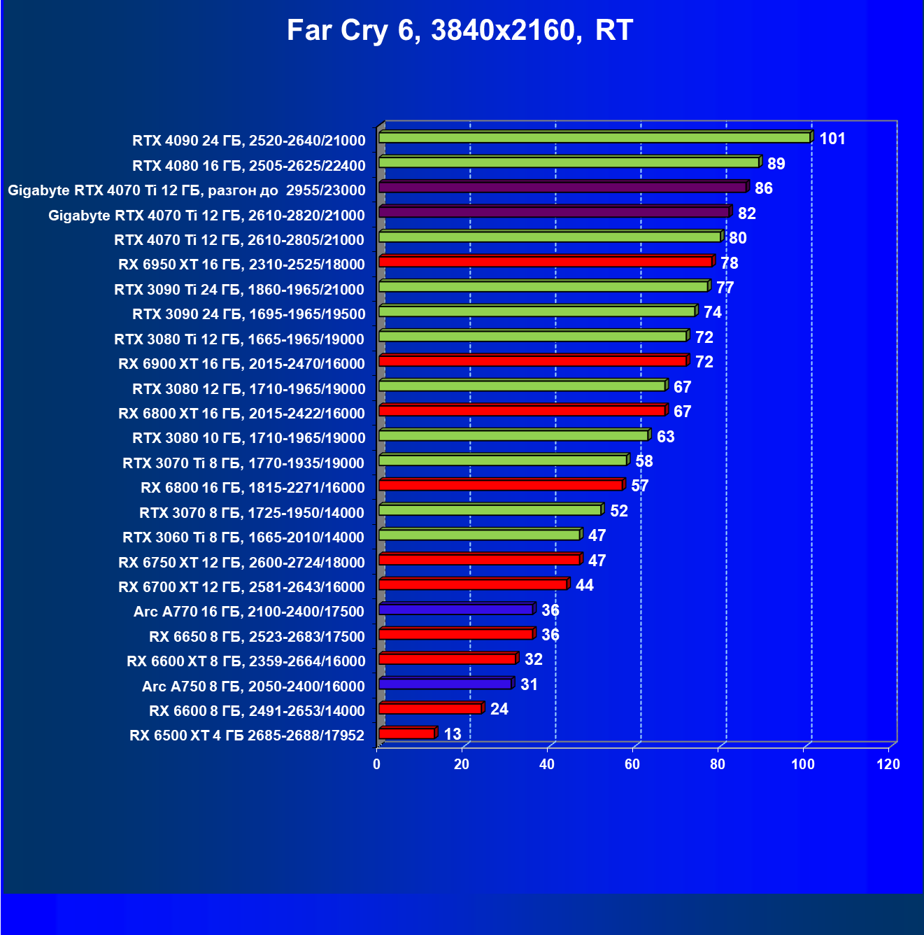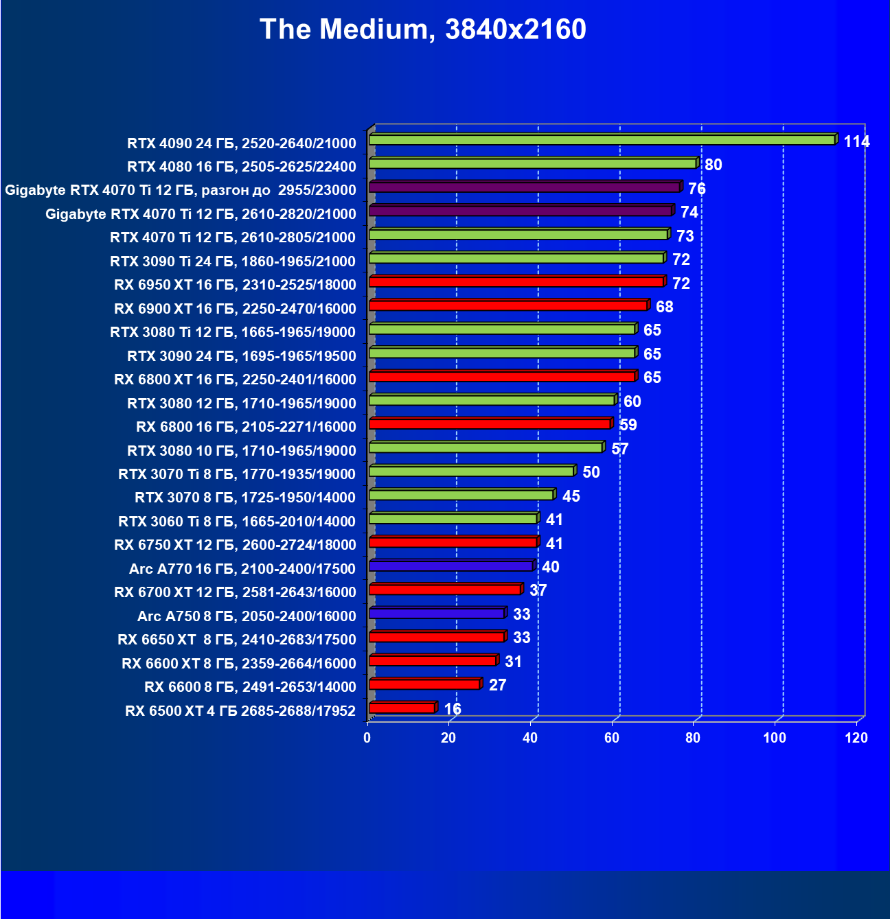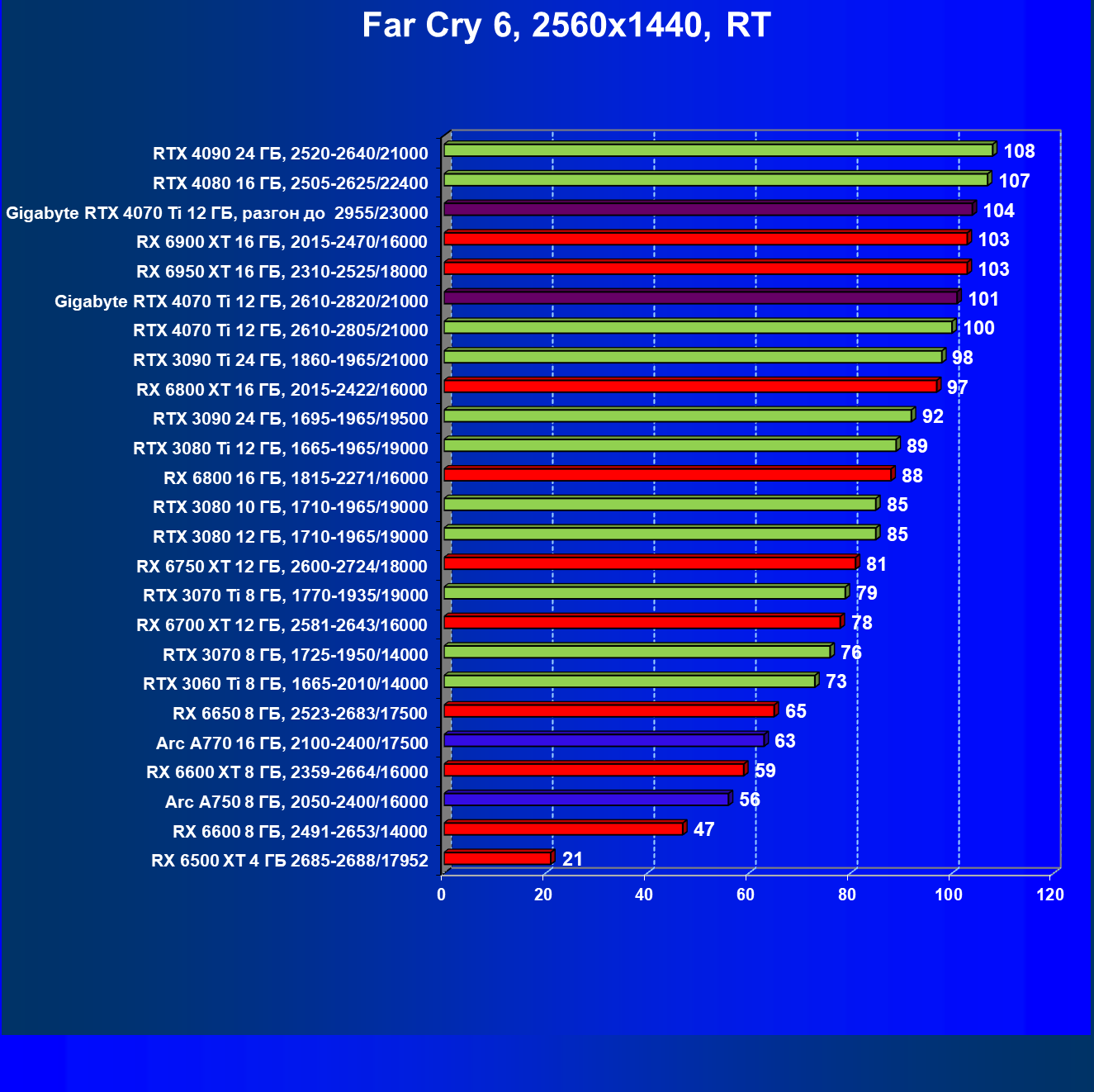 | 23 | RX 6950 XT 16 ГБ, 2310—2525/18000 | 107 | 892 | 83 100 |