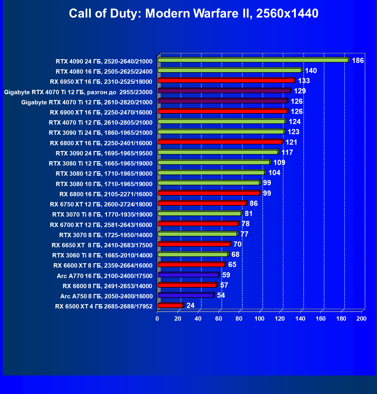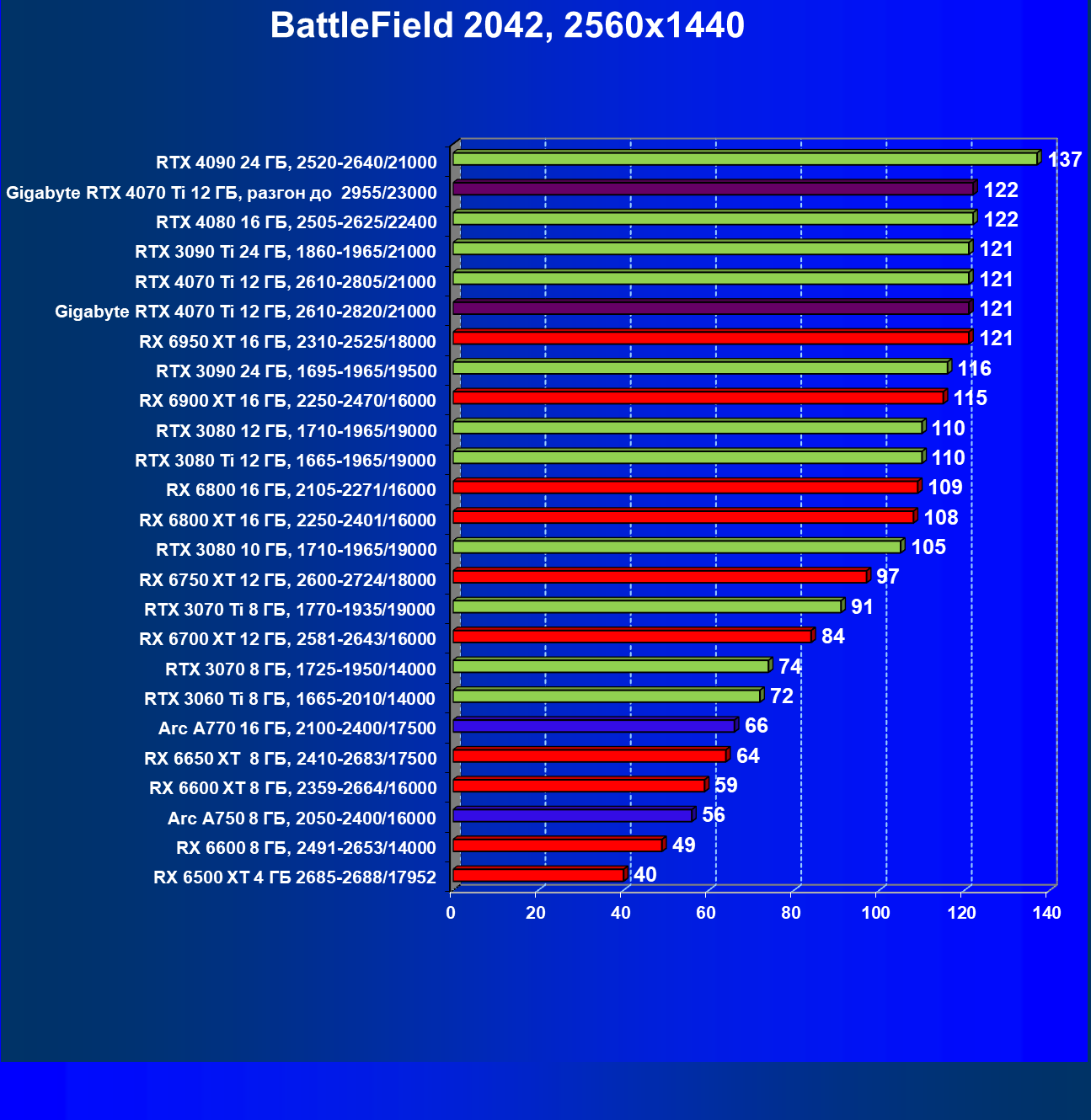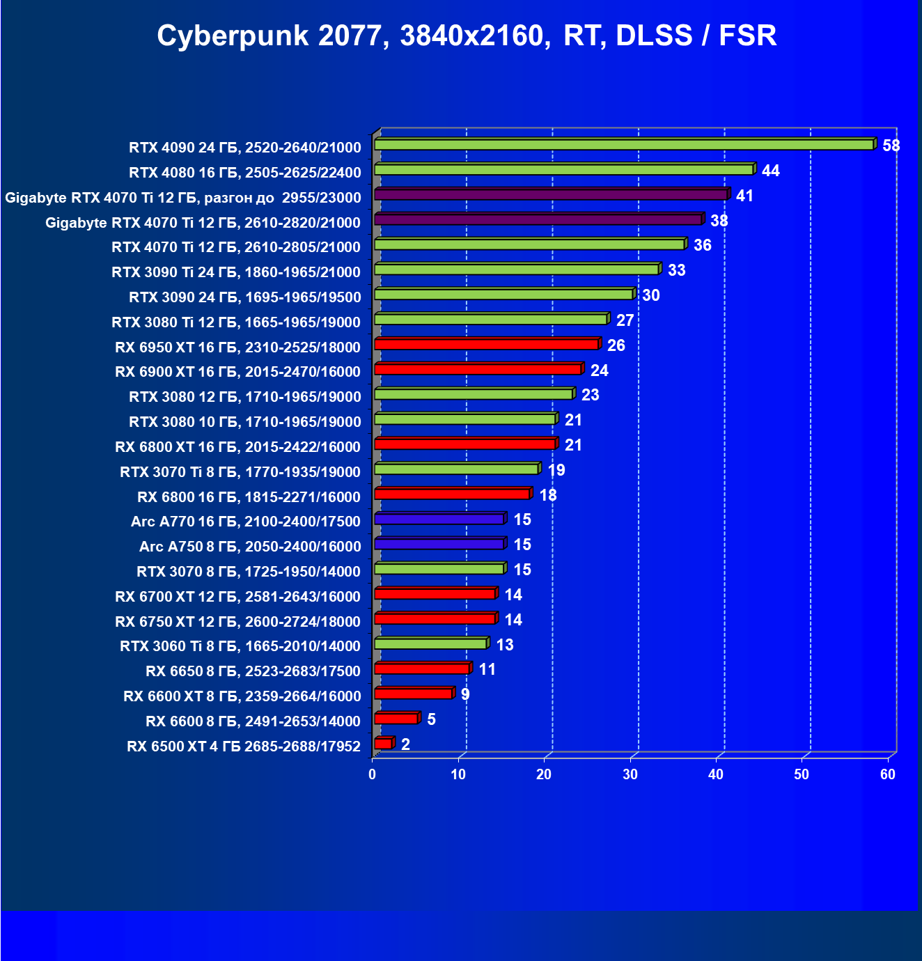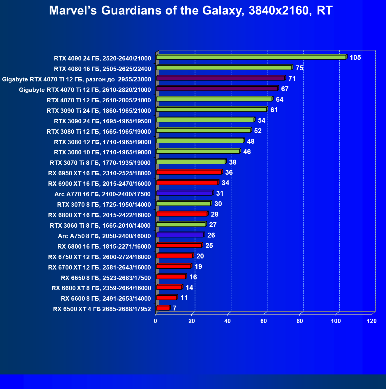 | 23 | RX 6950 XT 16 ГБ, 2310—2525/18000 | 107 | 892 | 83 100 |