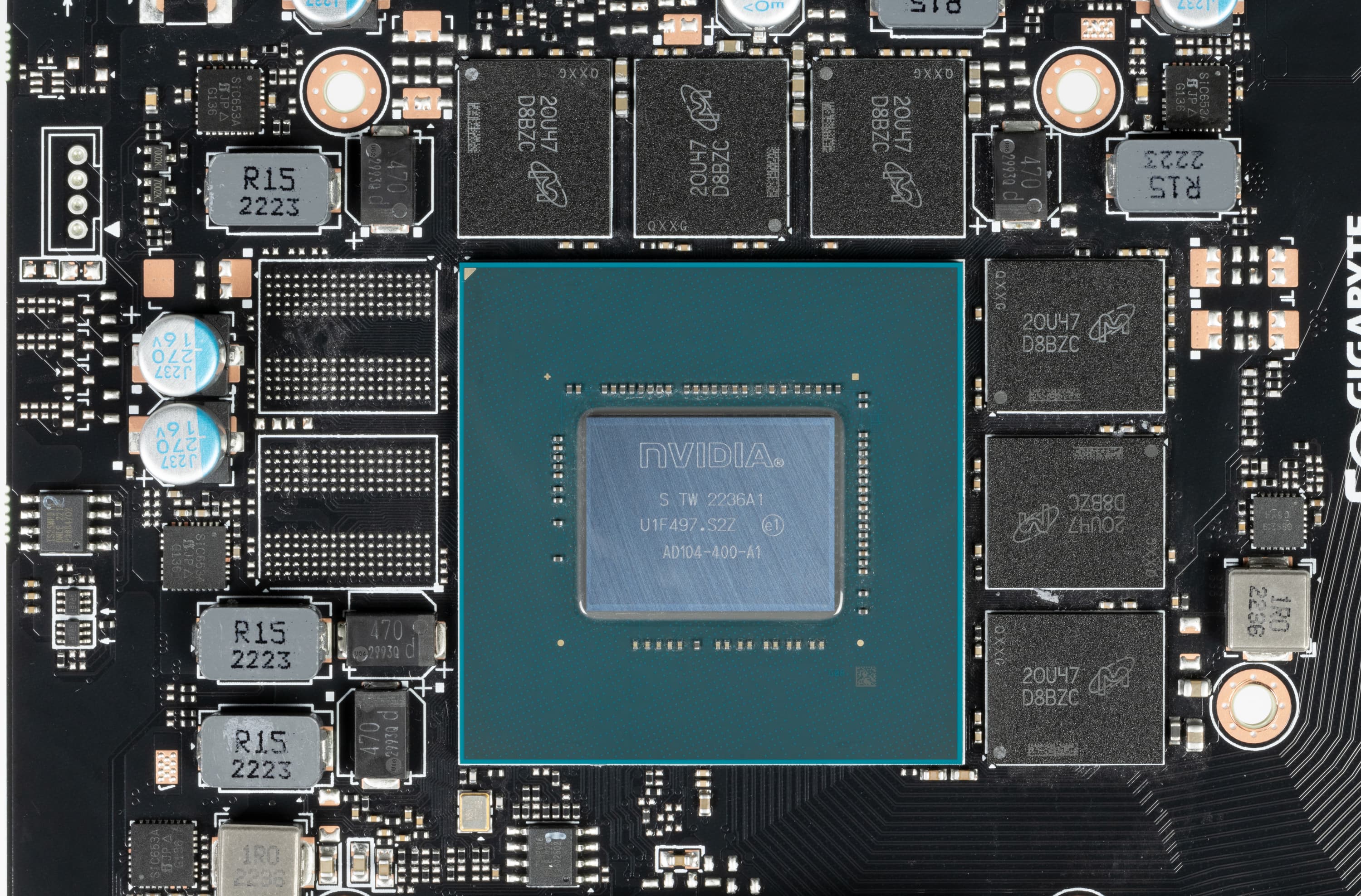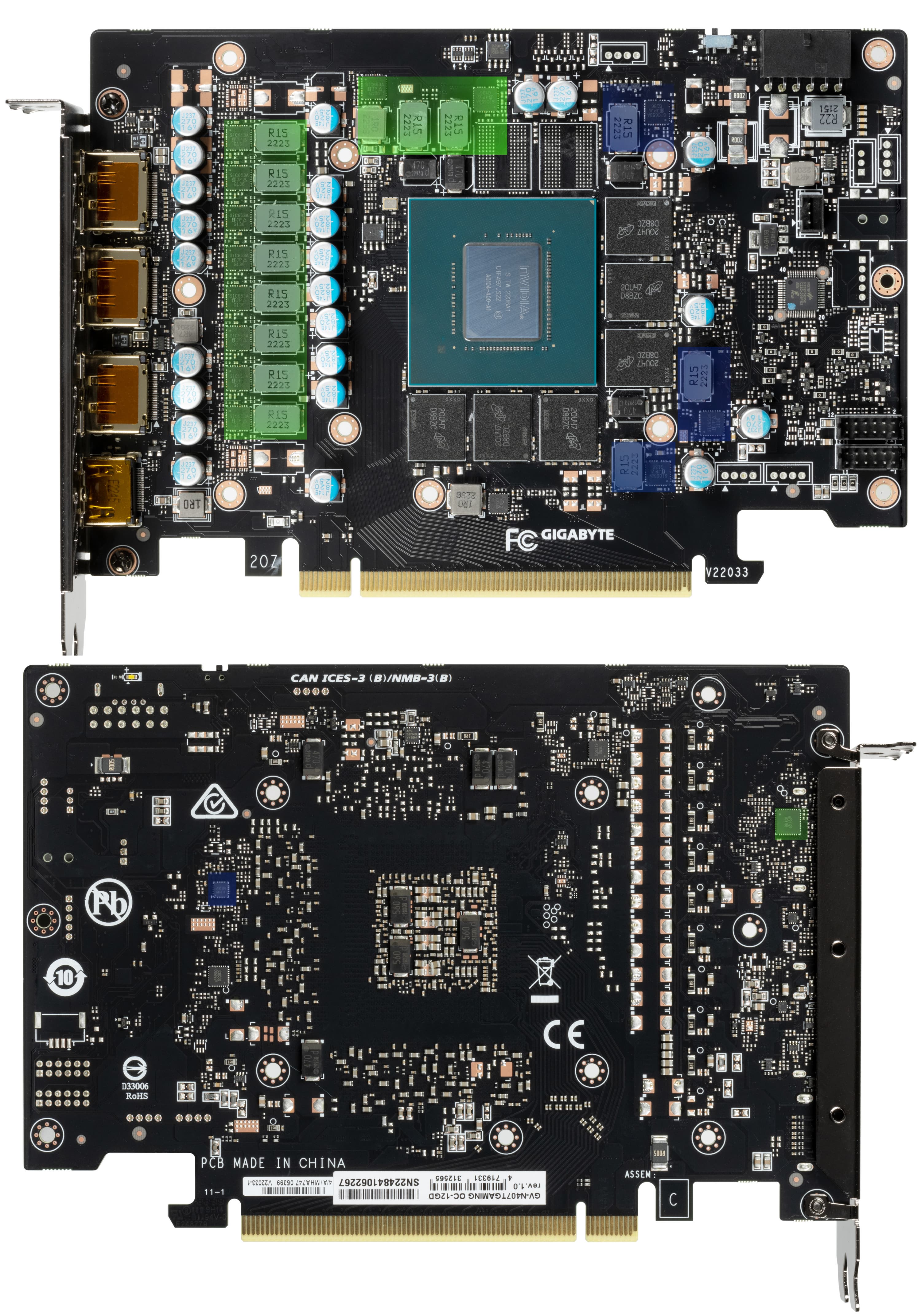 Ядро имеет маркировку AD104-400, защиты от майнинга нет (да и в нынешнее время не нужно), дата выпуска — 36-я неделя 2022 года (сентябрь).