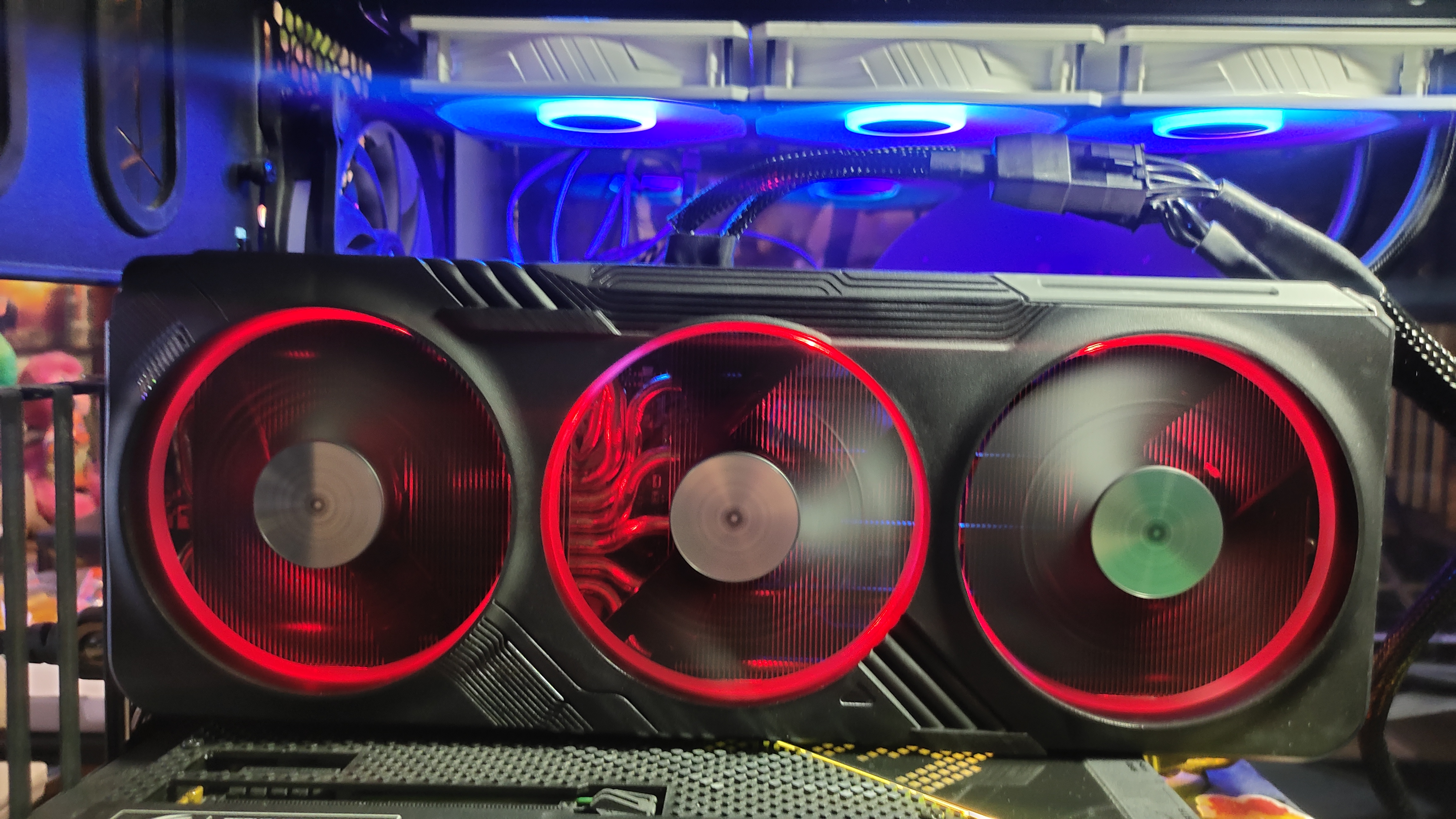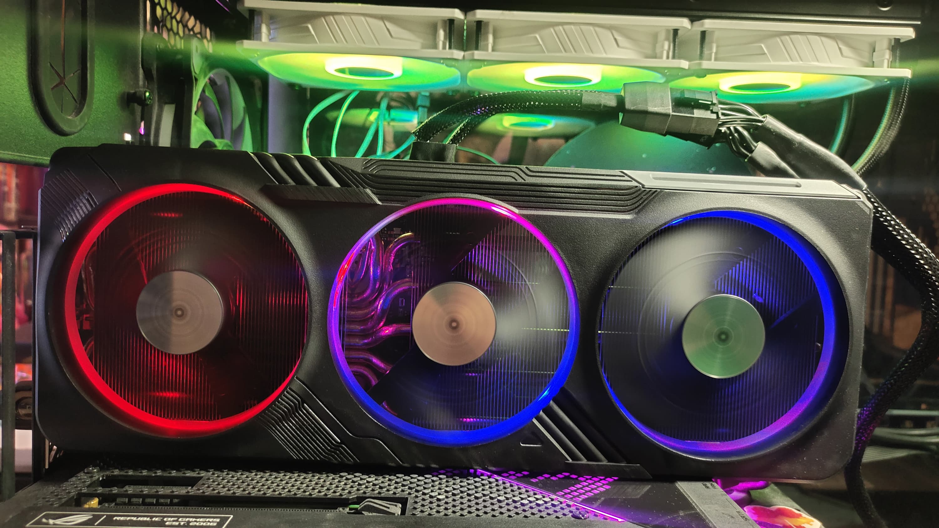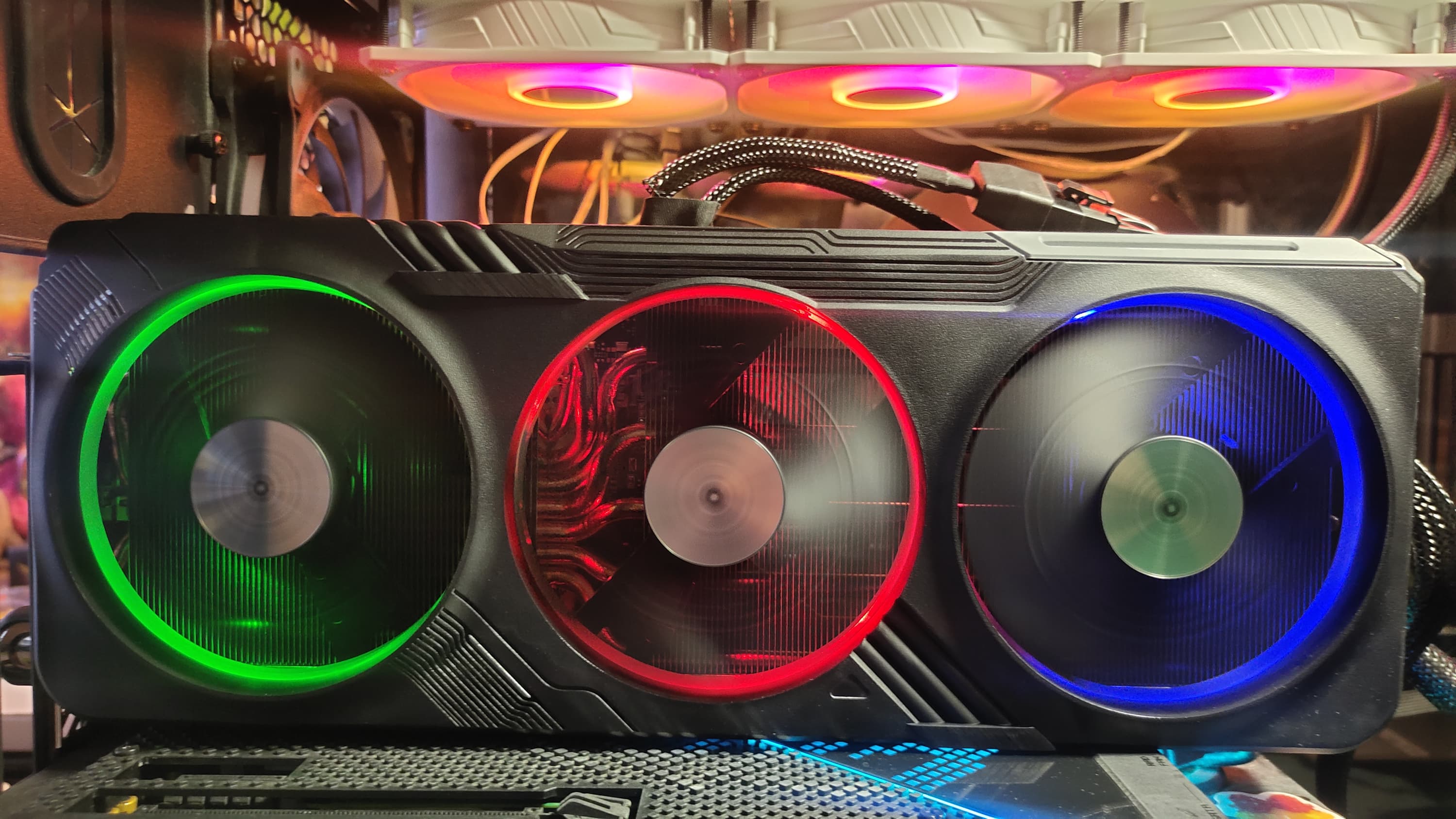 Карта имеет подсветку по ободам вентиляторов, а также подсвечен логотип компании на верхнем торце. Подсветка вокруг вентиляторов включается только при их вращении; когда они стоят — свечения нет.