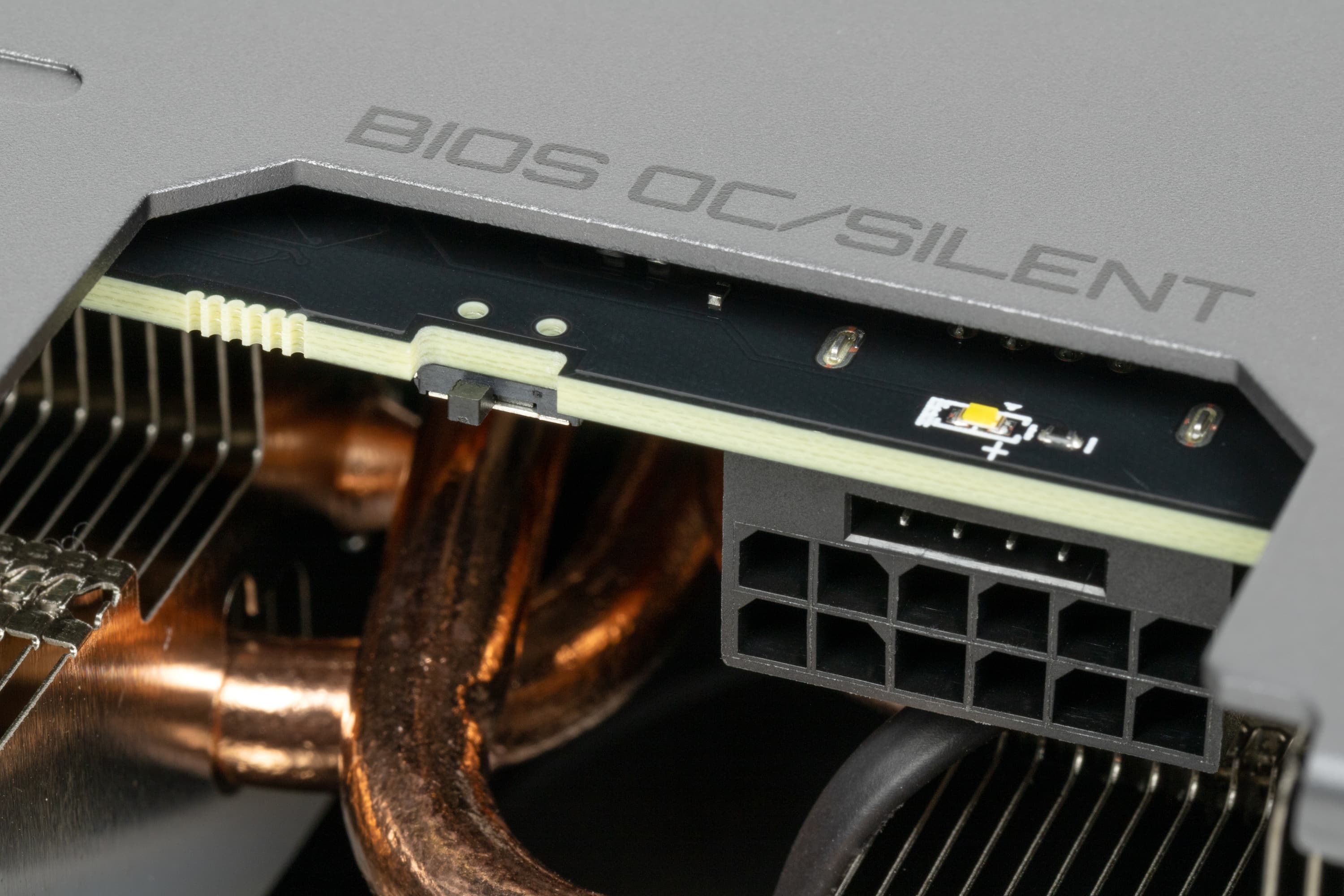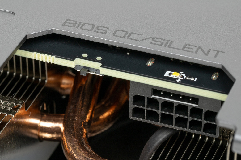 Карта имеет два режима работы, они заложены в двух вариантах BIOS, которые переключаются с помощью переключателя на верхнем торце карты: OC (производительный) и Silent (тихая работа системы охлаждения). Разница между режимами не только в оборотах вентиляторов, но и в частотах работы GPU, плюс небольшая разница в лимитах: предел энергопотребления для BIOS OC заложен в 325 Вт, а для BIOS Silent — 300 Вт.