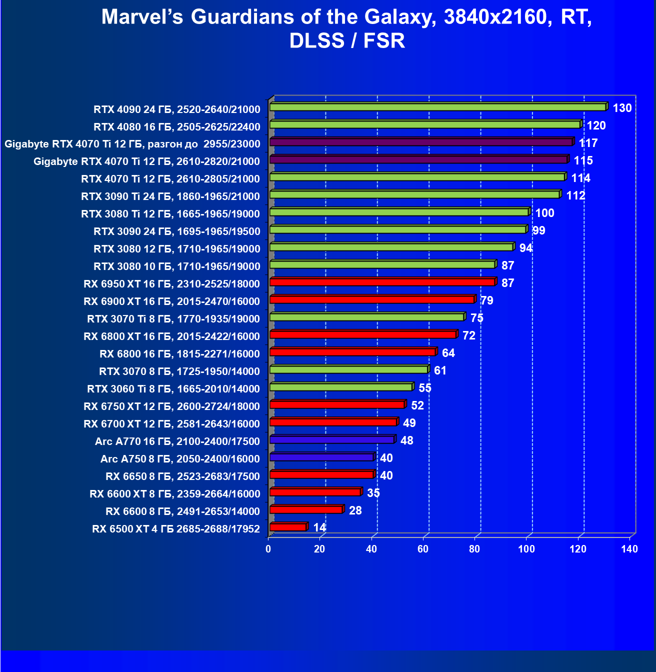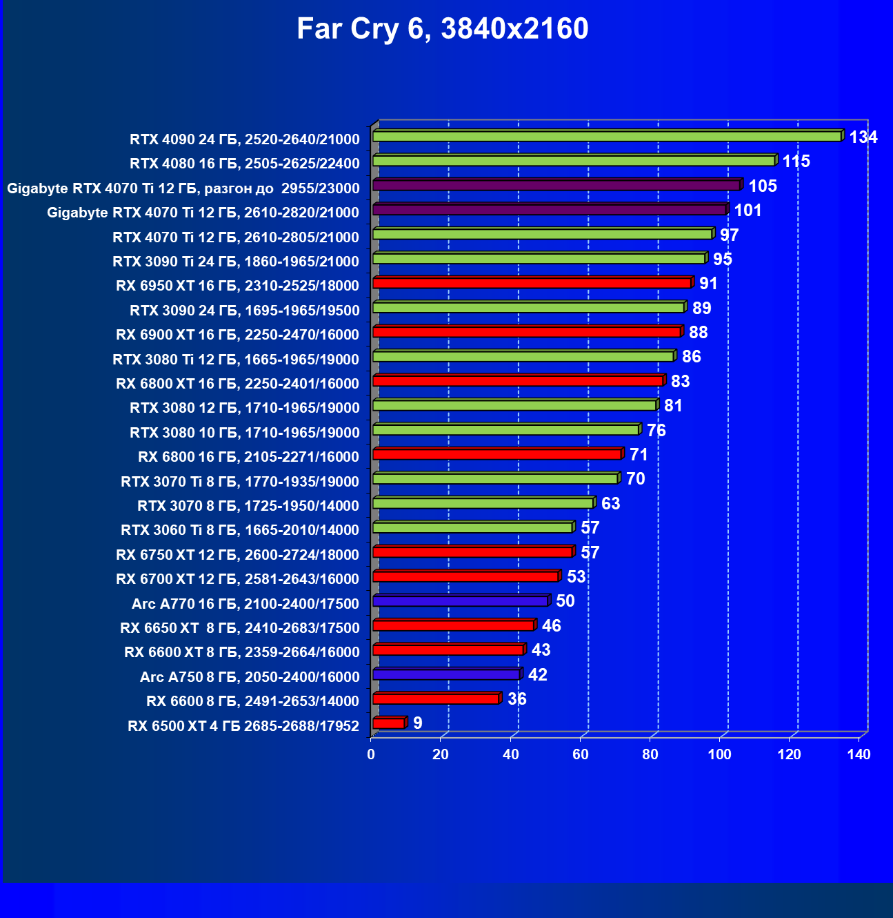 | 18 | Gigabyte RTX 4070 Ti Gaming OC 12 ГБ, 2610—2820/21000 | 56 | 472 | 84 000 |