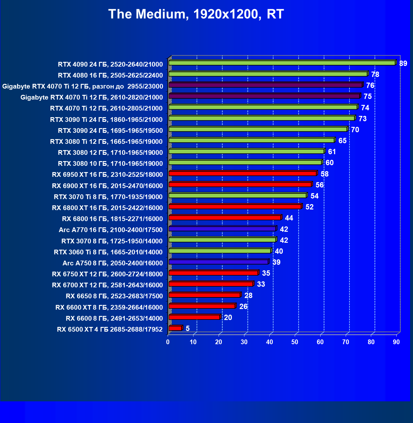 | 03 | Gigabyte RTX 4070 Ti Gaming OC 12 ГБ, разгон до 2955/23000 | 482 | 57 | 84 000 |