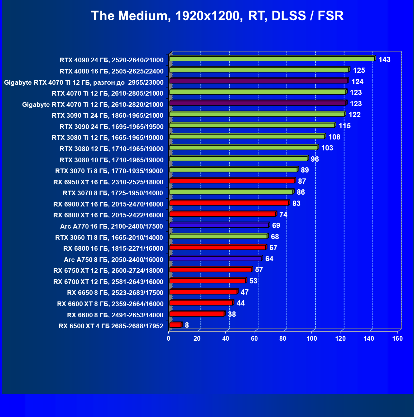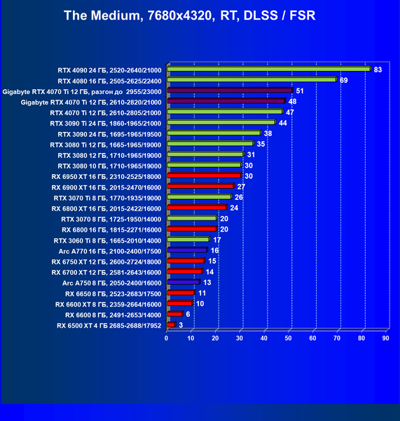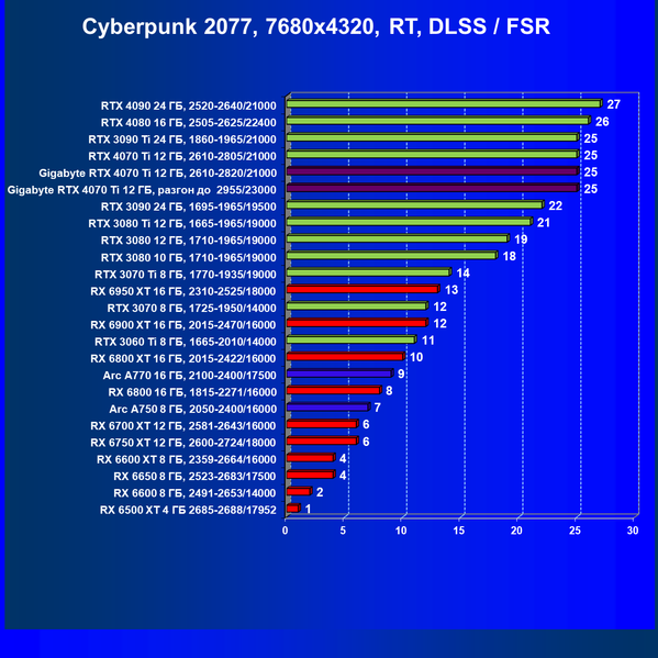 Летом 2022 года лидерство по производительности в классических играх было у GeForce RTX 3090 Ti и Radeon RX 6950 XT. Новинка RTX 4070 Ti в среднем демонстрирует небольшое превосходство по отношению RTX 3090 Ti и фактически «окончательно увольняет» ранее долго занимающих топовый пьедестал королей 3D. Если в этом году выйдет, к примеру, ускоритель RTX 4050 с 8—12 ГБ памяти, то, скорей всего, он заменит уже RTX 3080 10 ГБ, ведь такая новинка с новой архитектурой, так же, как и другие новинки 4ххх серии будет обладать преимуществами в виде пониженного потребления, а также версии DLSS 3.0.