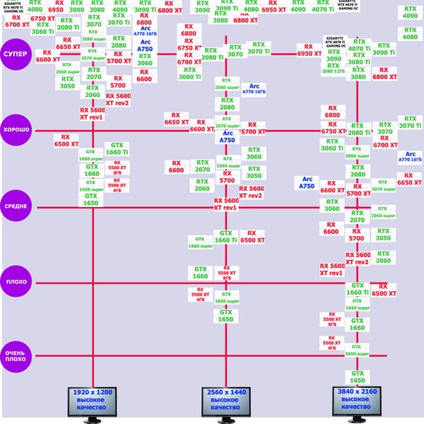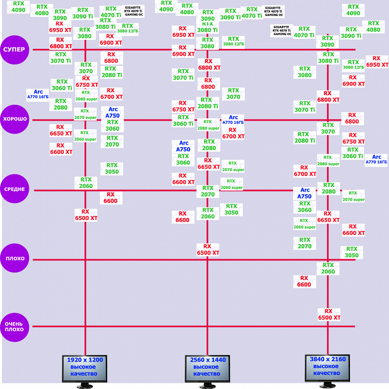 Новинка от Nvidia в лице RTX 4070 Ti отправляет топовые карты 2020 — 2022 годов на скамью запасных, «красную карточку» заслуженно получают RTX 3090/3090 Ti из-за своей меньшей производительности, но более высокой цены. Карты от AMD RX 6900 XT и RX 6950 XT сильно отстают по производительности, имея при этом схожие с новинкой ценники. За компанию вставил в рейтинг RTX 4080 16 ГБ с его более высокой ценой и сверх производительностью, даже эта карта оказывается выгоднее, чем RTX 3090 Ti.