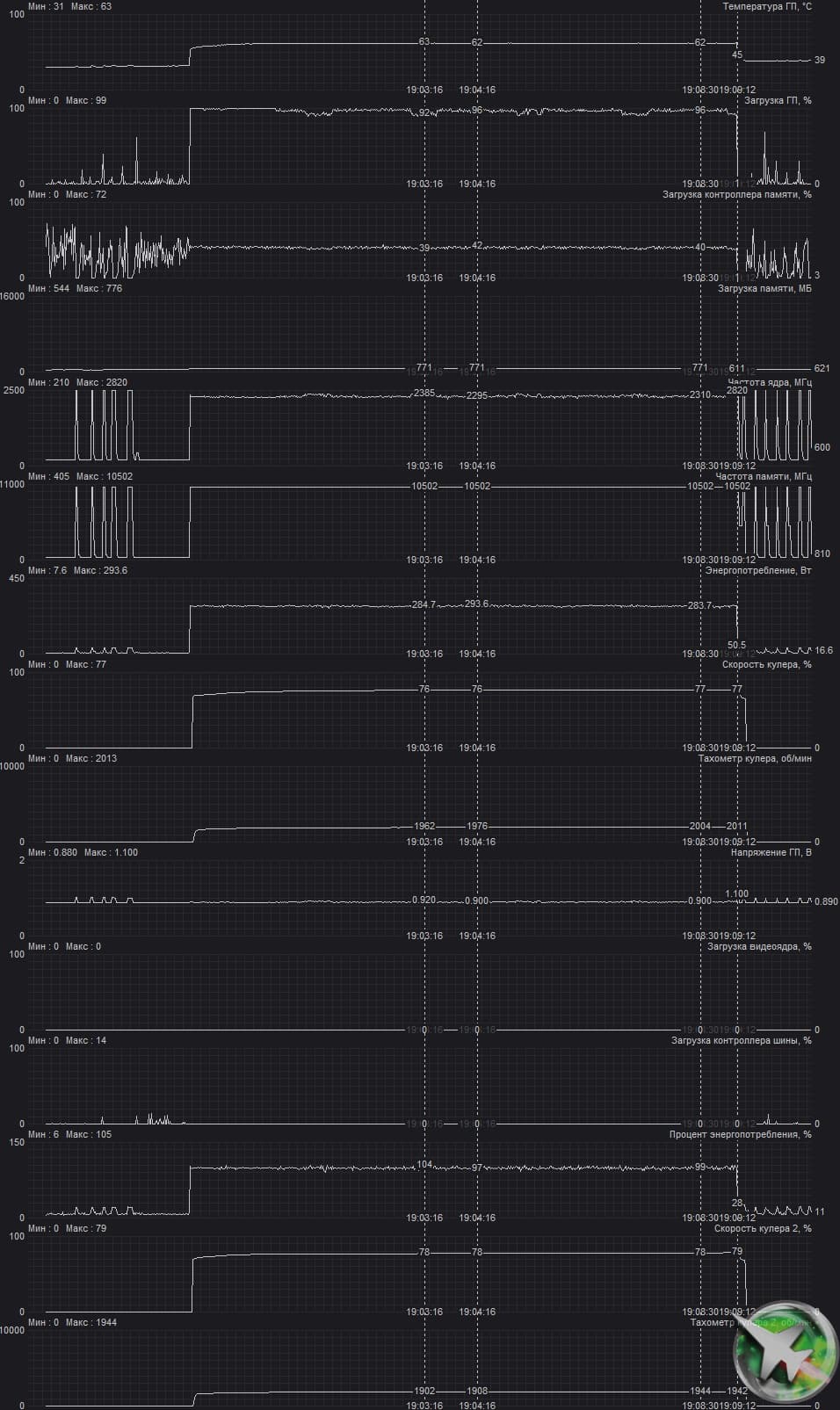 После 2-часового прогона под нагрузкой максимальная температура ядра не превысила 63 градуса, а температура микросхем памяти — 68 градусов, что является великолепным результатом для видеокарт такого уровня! Энергопотребление карты доходило до 294 Вт. Напомним, что безопасный предел нагрева памяти GDDR6X — 105 °C.