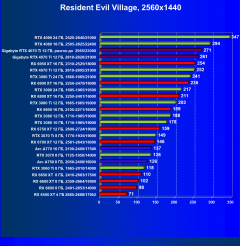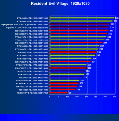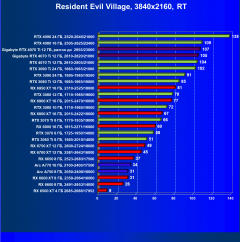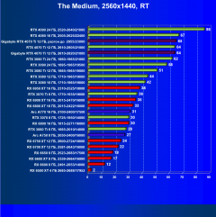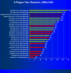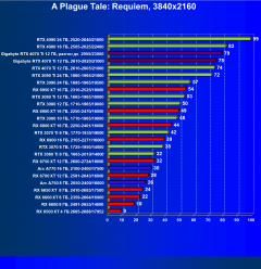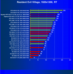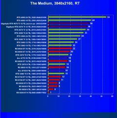 В данном случае лидерство RTX 4070 Ti выражено еще более ярко относительно флагманов AMD вследствие большего падения производительности у тех при включении RT. В среднем прирост производительности относительно RTX 3090 Ti по всем разрешениям составляет 2,5%, а в разрешении 4К — 4%. Разница же в производительности с RX 6950 XT в данном случае составляет 20% по всем разрешениям и аж 46% в 4K. Карта Gigabyte смотрится еще более выигрышно засчет повышенных частот работы.