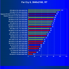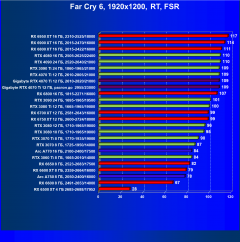 При активации в играх трассировки лучей, мы получаем более приятную и реалистичную картинку, однако падение FPS неизбежно, и это особенно выражено у карт AMD 6ххх серии, и хотя им сейчас весьма неплохо помогает включение FSR, и даже бывший титан Radeon RX 6950 XT способен давать приемлемый комфорт с RT + FSR в разрешении 4K.