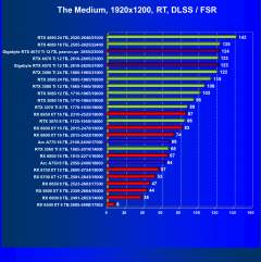Рейтинг составлен по 9 тестам, в которых используется технология трассировки лучей и одновременно технологии Nvidia DLSS, AMD FSR или Intel XeSS. Этот рейтинг нормирован по самому слабому ускорителю в данной группе — Radeon RX 6500 XT (то есть сочетание скорости и функций Radeon RX 6500 XT приняты за 100%).