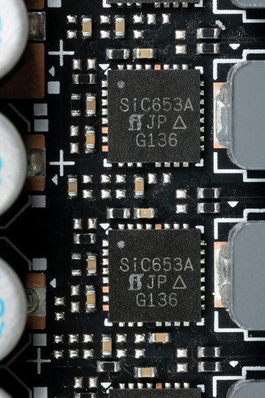 В преобразователе питания, традиционно для всех видеокарт Nvidia, используются транзисторные сборки DrMOS — в данном случае SIC653A (Vishay Siliconix), каждая из которых рассчитана максимально на 50 А.