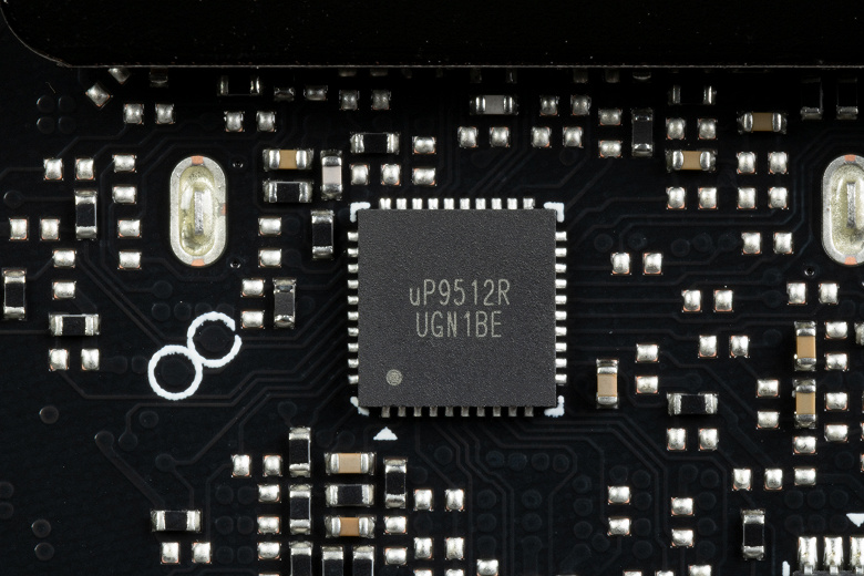 10 фазами питания ядра управляет ШИМ-контроллер uP9512R (uPI Semiconductor) расположенный на оборотной стороне PCB. Он рассчитан максимум на 12 фаз.