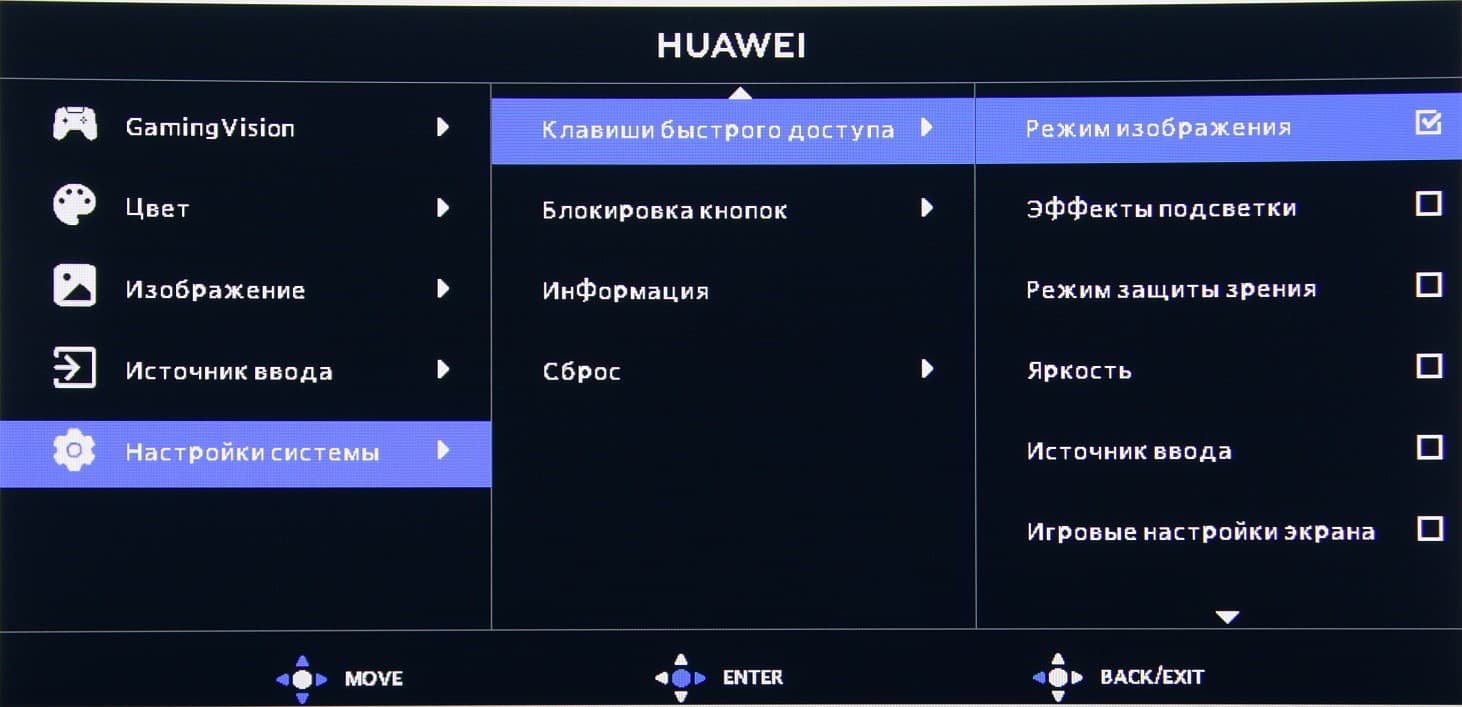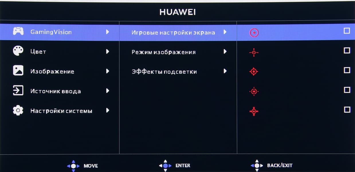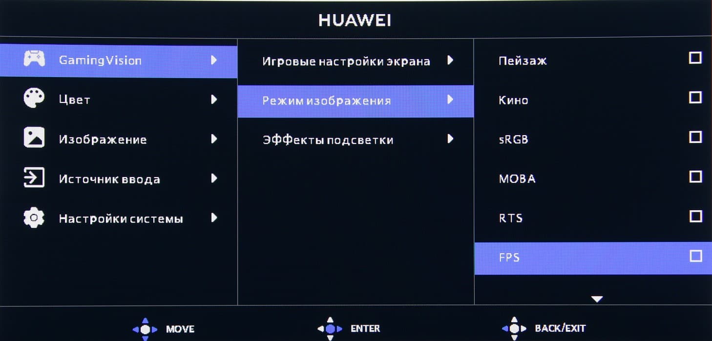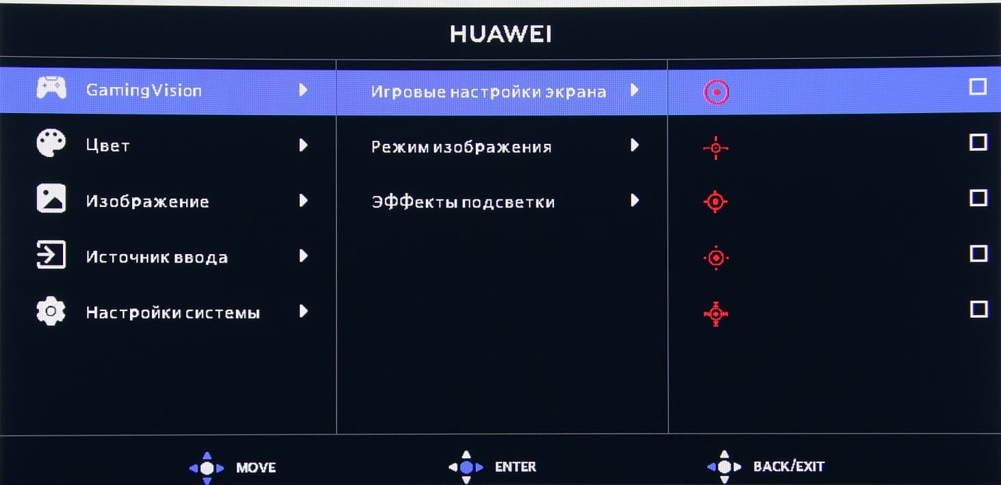 Настроек, влияющих на яркостный и цветовой баланс, не очень много, что для игрового монитора ожидаемо. Есть регулировки яркости (подсветки) и контрастности, подстрока различимости градаций в тенях, функция принудительного снижения яркости и интенсивности синей компоненты.