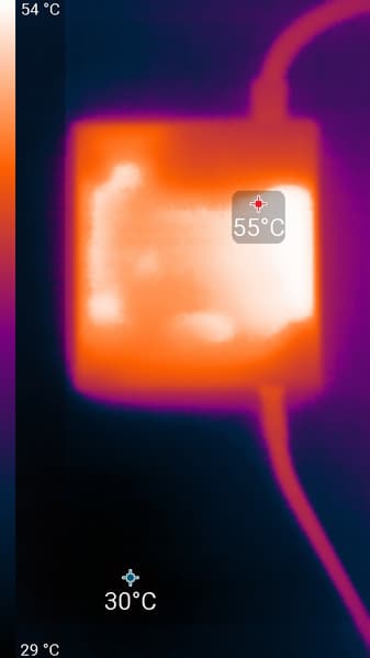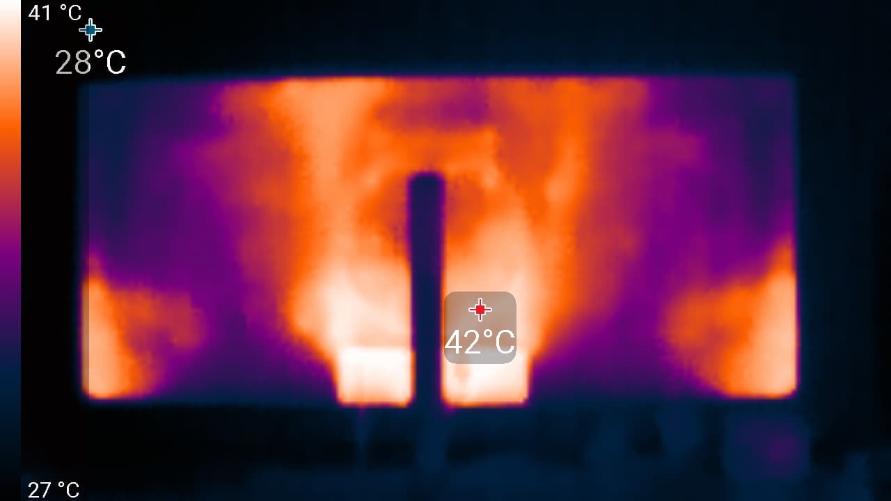 По распределению областей нагрева, можно предположить, что внизу находится светодиодная линейка подсветки экрана. Нагрев сзади умеренный. Корпус БП нагрелся до 55 °C, что весьма много: