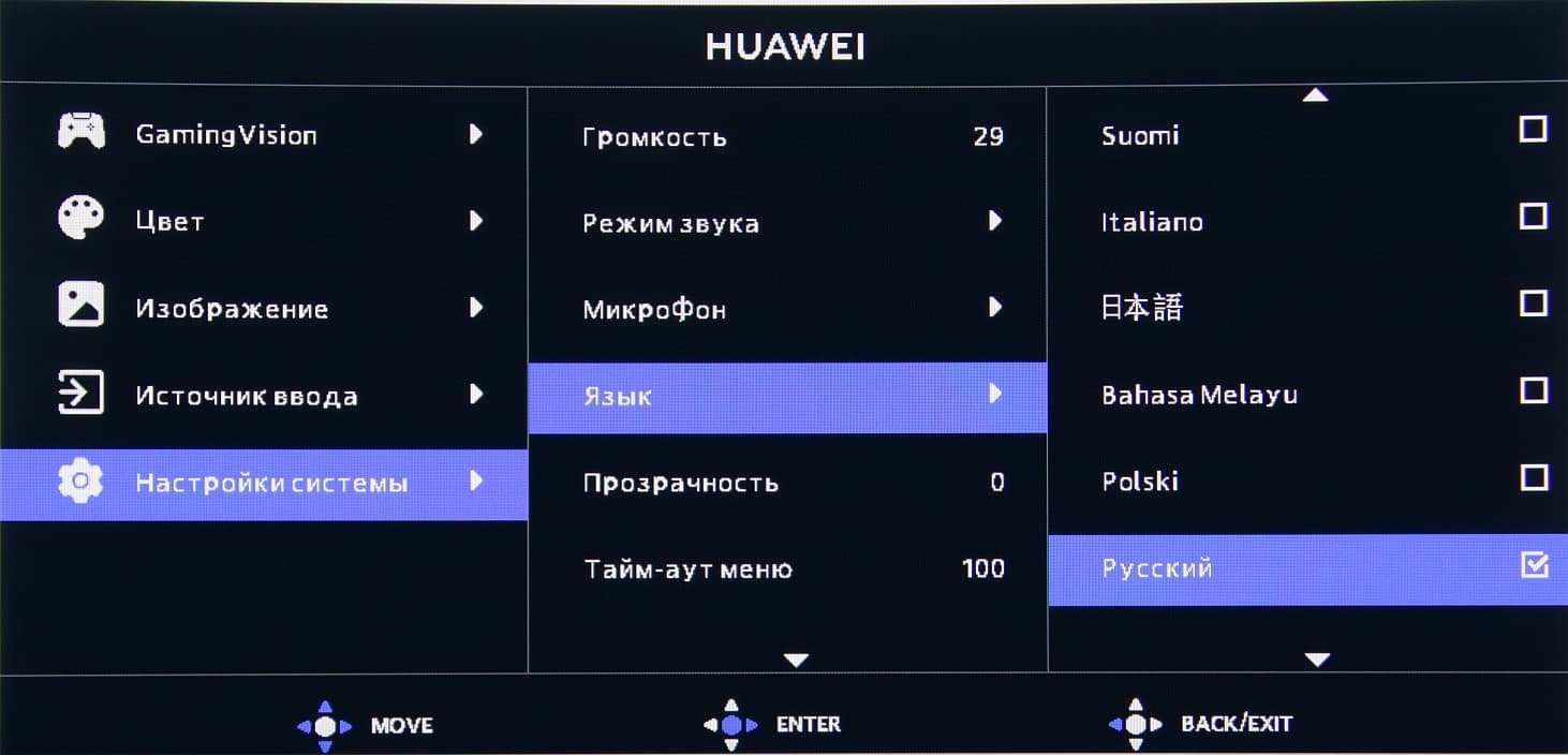 Навигация удобная, так как все делается только джойстиком, не нужно переносить палец на кнопки, к тому же списки зациклены. При настройке изображения меню остается на экране — это несколько мешает оценке вносимых изменений. Настраиваются уровень прозрачности фона и задержка автоматического выхода из меню. Чтобы предотвратить нежелательное изменение настроек, можно включить блокировку джойстика. Присутствует русская версия экранного меню.