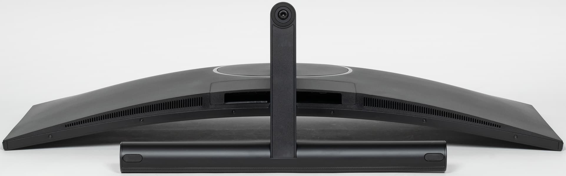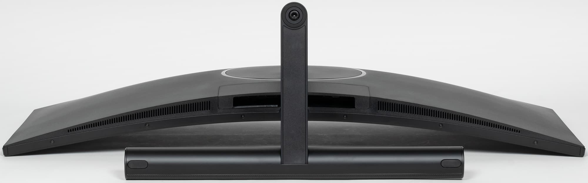 В цилиндрической части основания размещены громкоговорители, что позволяет производителю заявлять о встроенном в монитор саундбаре. Спереди на этом саундбаре есть сенсорная полоска с центральной вставкой из полупрозрачного пластика, которая изнутри подсвечивается несколькими многоцветными светодиодами. Этот элемент выполняет как декоративную функцию, так и работает в качестве регулятора и индикатора уровня громкости. Режимы работы подсветки настраиваются в меню установок, при этом подсветка остается включенной и в режиме ожидания. Работу подсветки демонстрирует видео ниже: