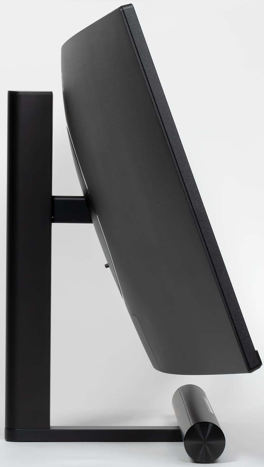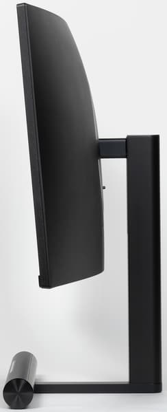 На верхнем и на нижнем торце есть вентиляционные решетки. Основание подставки выполнено в виде буквы Т. «Нога» этой буквы, а также цилиндрическая «перекладина», решетка на ней и торцевые заглушки изготовлены из алюминиевого сплава, анодированы и покрашены в черный цвет. Снизу на «ноге» есть заглушка из черного пластика. Основание подставки обеспечивает монитору хорошую устойчивость. Резиновые накладки снизу на опорных плоскостях основания подставки защищают поверхность стола от царапин и предотвращают скольжение монитора на гладких поверхностях. Выдвинутая вперед и довольно высокая цилиндрическая часть снижает эффективность использования рабочей поверхности стола. Например, для размещения клавиатуры потребуется выделить достаточно места от переднего края стола до переднего края подставки.