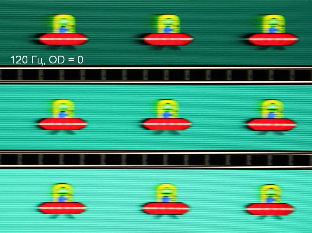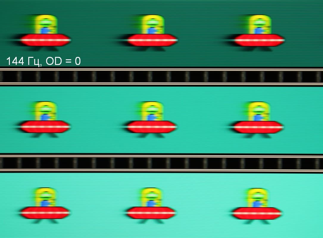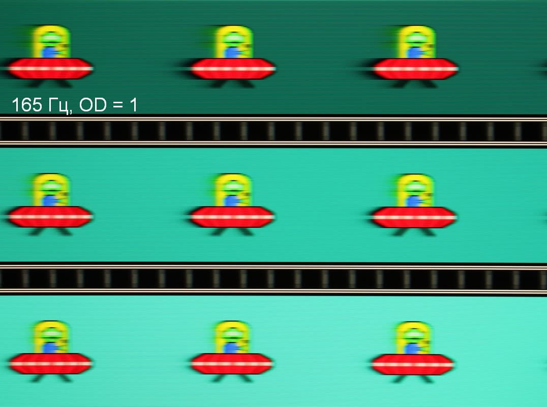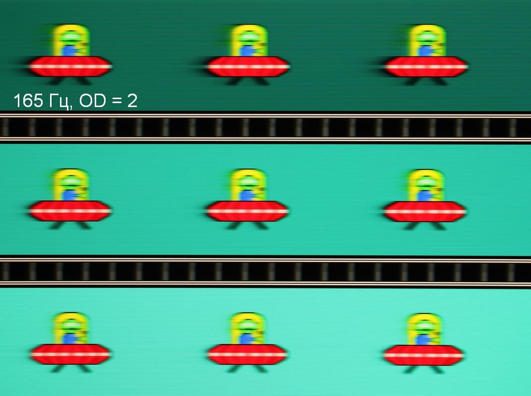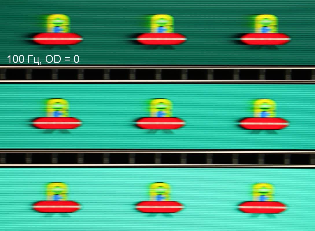 Для наглядного представления о том, что на практике означает такая скорость матрицы, и какие могут быть артефакты от разгона, приведем серию снимков, полученных с помощью движущейся камеры. Такие снимки показывают, что видит человек, если он следит глазами за двигающимся на экране объектом. Описание теста приведено тут, страница с самим тестом тут. Отметим, что получить хорошие по качеству снимки в этом тесте в случае изогнутого монитора сложно. Использовались рекомендованные установки (скорость движения 960, 990, 1000 или 1008 пиксель/с, то есть на целое число пикселей за кадр), выдержка 1/15 с, на фотографиях указаны значения частоты обновления, а также настройки Ускорение монитора (сокращено до OD — от Overdrive).