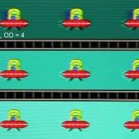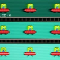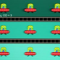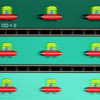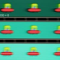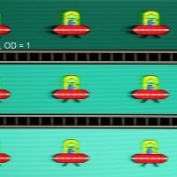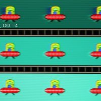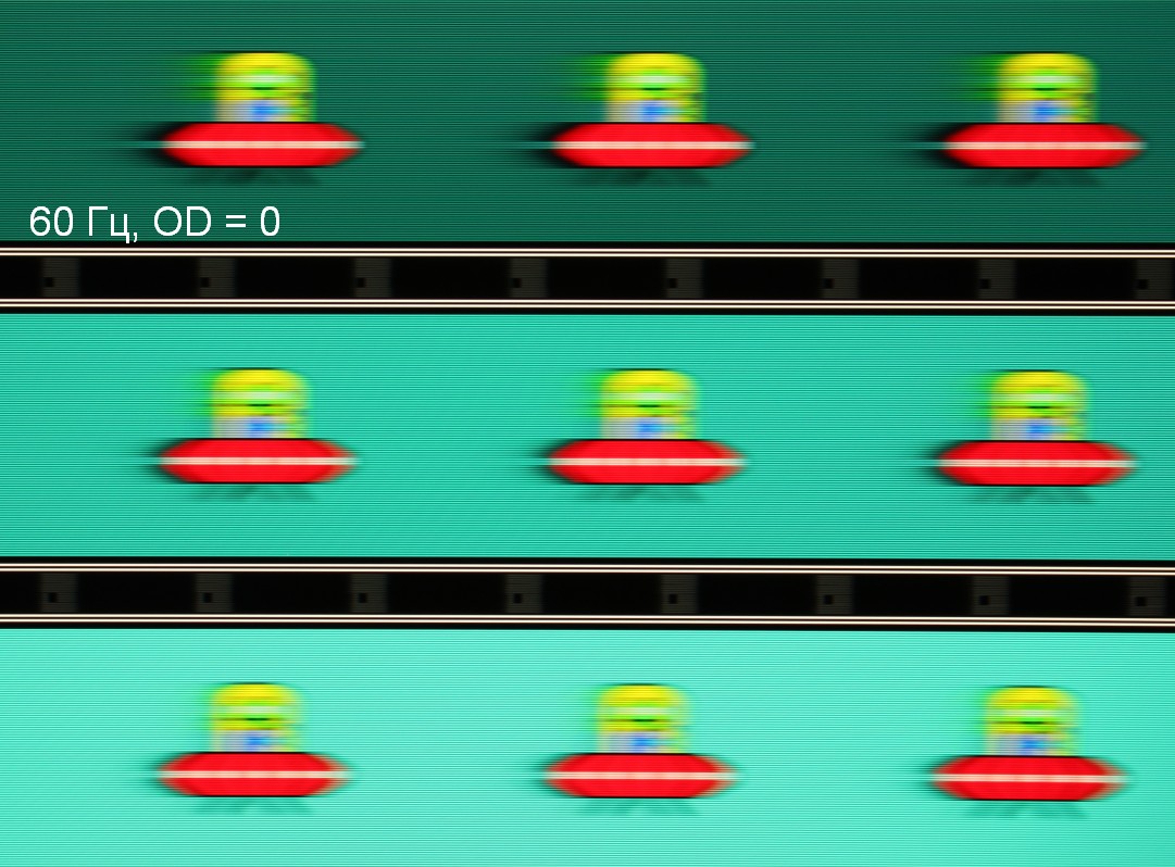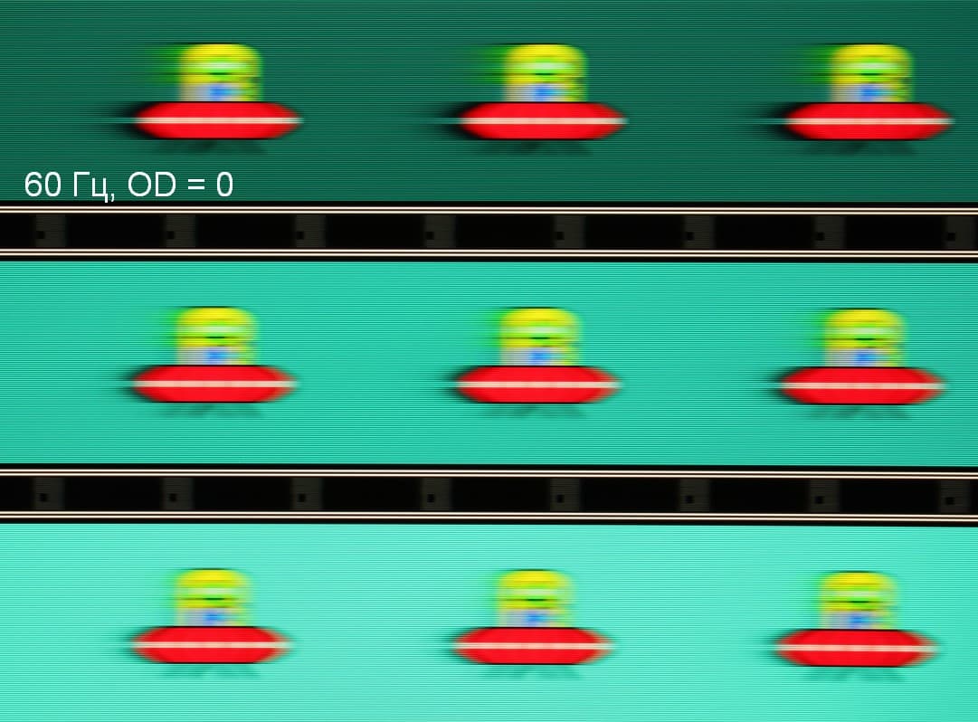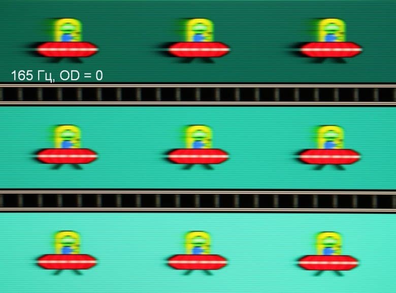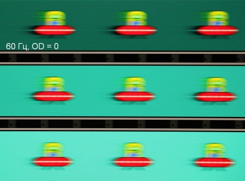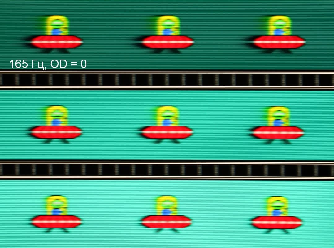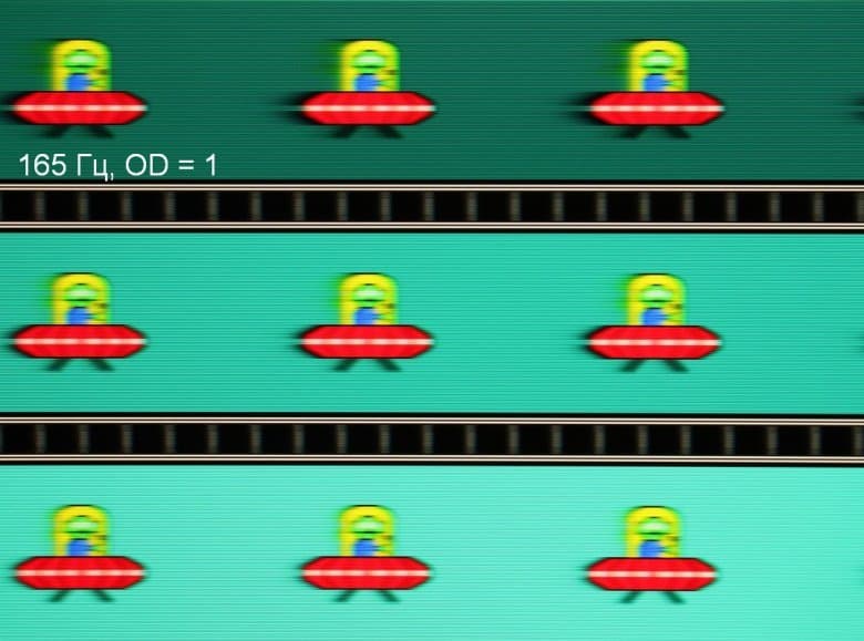 Для наглядного представления о том, что на практике означает такая скорость матрицы, и какие могут быть артефакты от разгона, приведем серию снимков, полученных с помощью движущейся камеры. Такие снимки показывают, что видит человек, если он следит глазами за двигающимся на экране объектом. Описание теста приведено тут, страница с самим тестом тут. Отметим, что получить хорошие по качеству снимки в этом тесте в случае изогнутого монитора сложно. Использовались рекомендованные установки (скорость движения 960, 990, 1000 или 1008 пиксель/с, то есть на целое число пикселей за кадр), выдержка 1/15 с, на фотографиях указаны значения частоты обновления, а также настройки Ускорение монитора (сокращено до OD — от Overdrive).