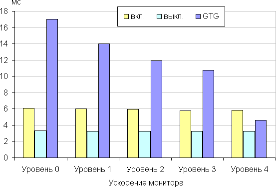 Время отклика зависит от значения настройки Ускорение монитора, которая управляет разгоном матрицы. График ниже показывает, как меняется время включения и выключения при переходе черный-белый-черный (столбики «вкл.» и «выкл.»), а также среднее суммарное время для переходов между полутонами (столбики «GTG») для шести значений этой настройки: