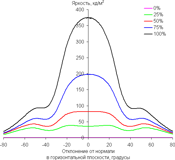 По скорости падения яркости углы обзора неширокие. Отметим примерно одинаковый характер уменьшения яркости при отклонении от перпендикуляра к экрану во всех трех направлениях, при этом графики не пересекаются во всем диапазоне измеряемых углов. При отклонении в вертикальном направлении яркость черного поля достигает большего значения, чем в двух других случаях. Однако максимум яркости черного поля все равно гораздо меньше, чем в случае типичного монитора на матрице IPS. Контрастность в диапазоне углов ±82° остается существенно выше значения 10:1.