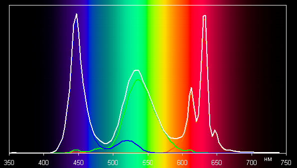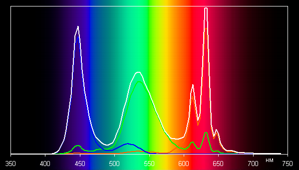 Ниже приведен спектр для белого поля (белая линия), наложенный на спектры красного, зеленого и синего полей (линии соответствующих цветов), когда в явном виде нет корректировки цветового охвата