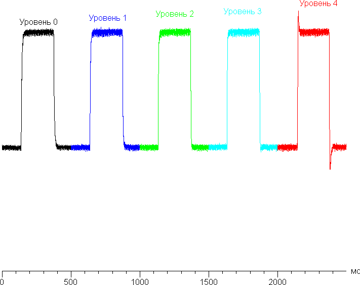 Приведем зависимости яркости (вертикальная ось) от времени (горизонтальная ось) при чередовании белого и черного кадра при 165 Гц кадровой частоты (первая ступень разгона, хотя на других все так же):