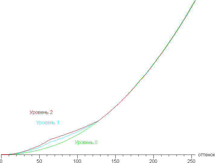 Дополнительной настройкой Оптимизация темного (три уровня) можно скорректировать гамма-кривую, улучшая различимость деталей в тенях. Это может быть полезно в играх с темными сценами. Ниже приведены гамма-кривые при трех значениях этой настройки: