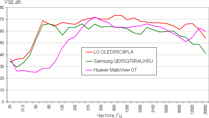 Качество встроенных в подставку громкоговорителей среднее. Очень условно их качество можно оценить, послушав звук второго видео в этой статье. Для сидящего перед монитором пользователя они достаточно громкие, низких частот нет совсем, есть выраженный призвук из-за резонансов корпуса саундбара, стереофонический эффект выражен хорошо. Отчасти невысокое качество компенсируется неожиданной близостью к пользователю, что увеличивает эффект погружения в звуковую сцену, в частности делает стереофонический эффект более выраженным. Сравним АЧХ этого монитора с АЧХ двух телевизоров высшего класса (воспроизводился розовый шум, уровни звукового давления в 1/3 октавах записывал шумомер Октава-110А-Эко, 30 дБ — это примерно фоновый уровень шума):