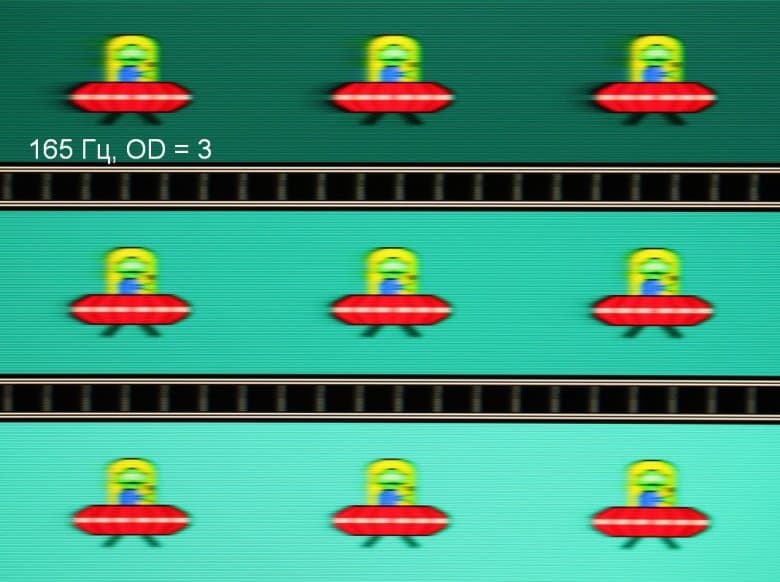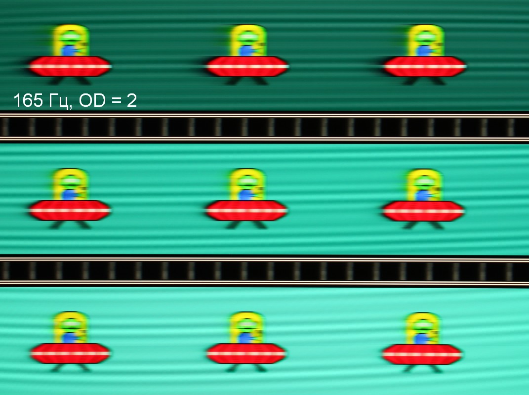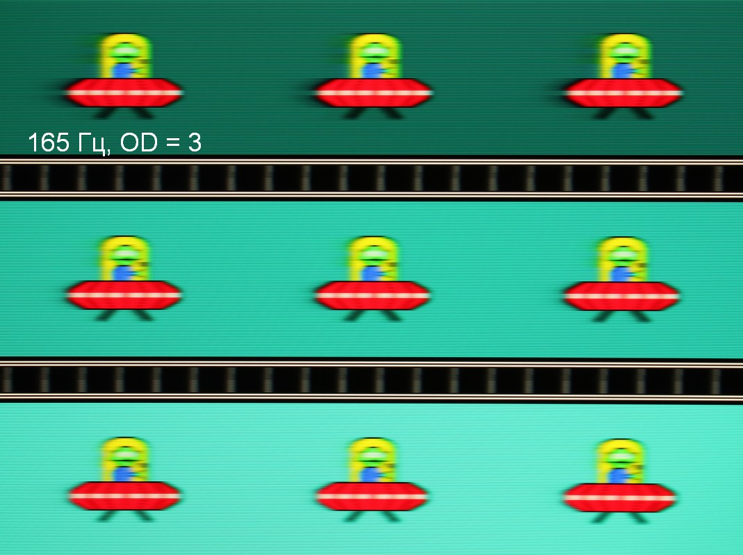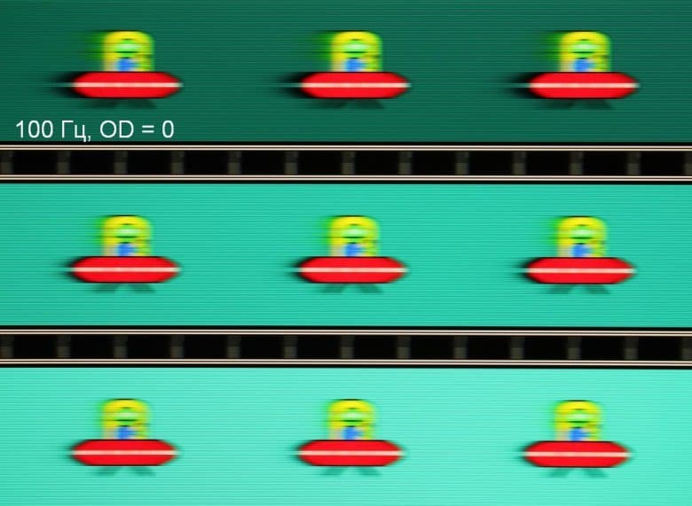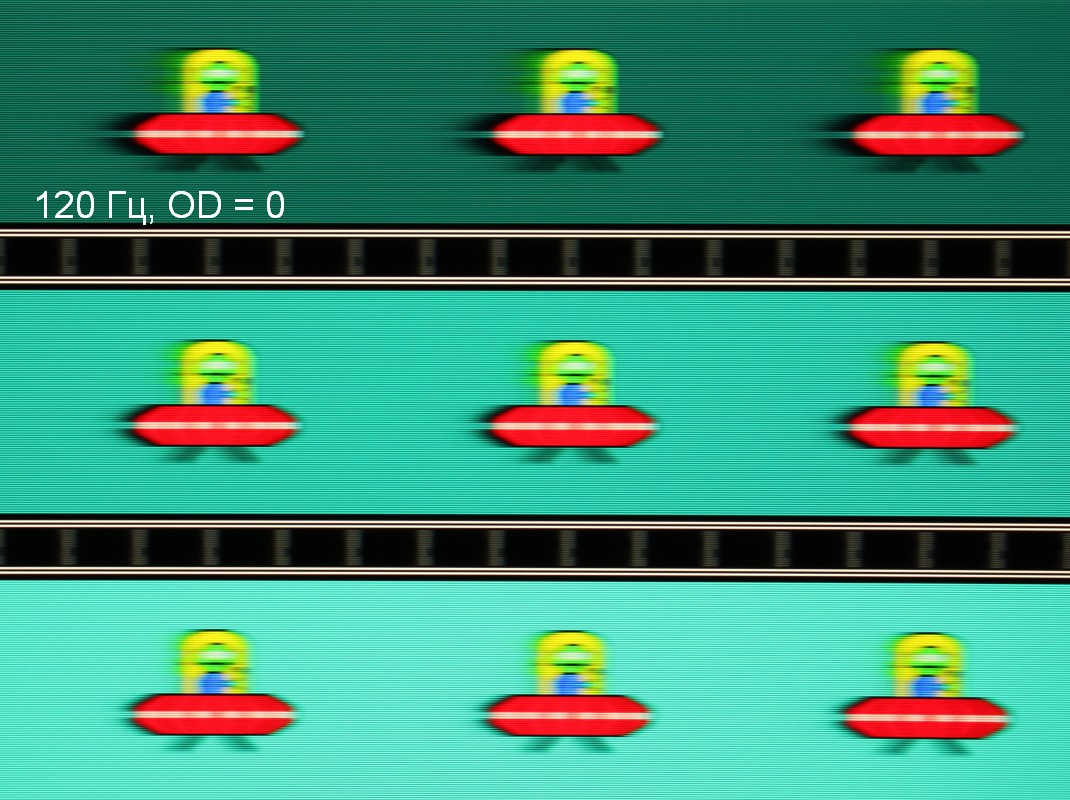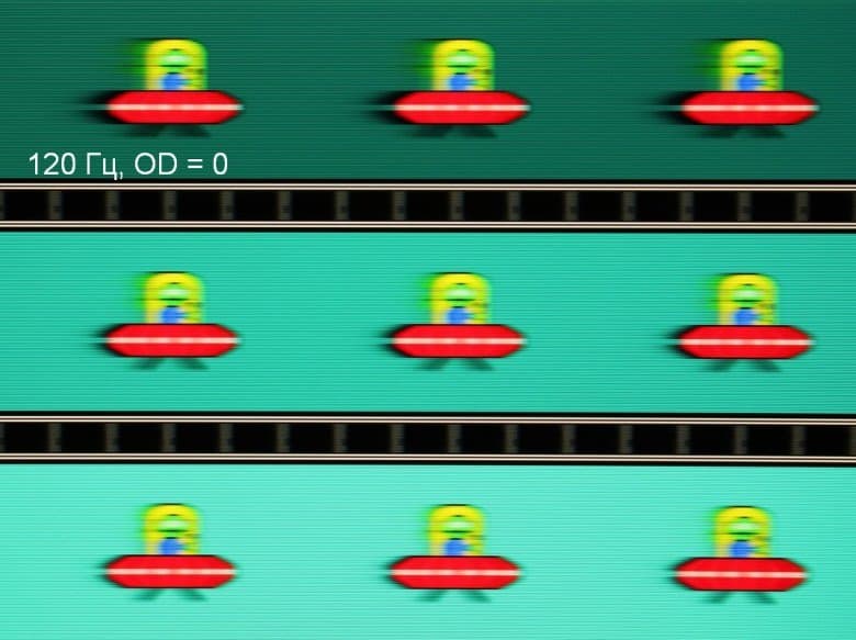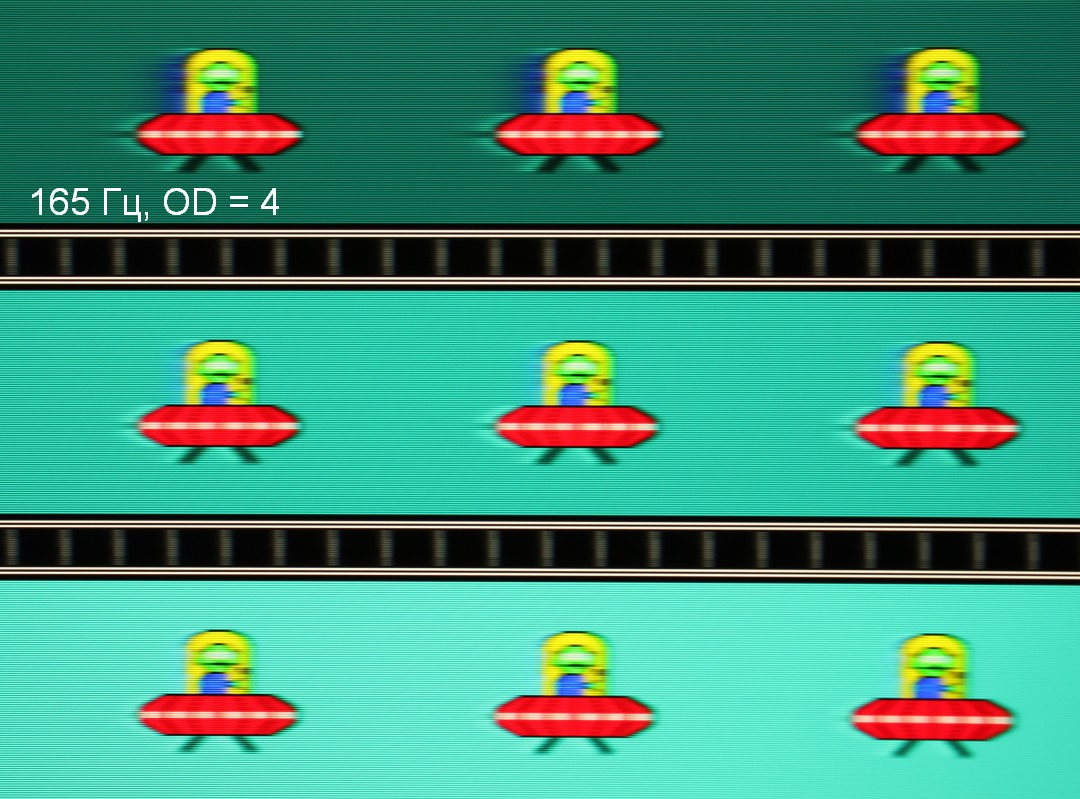Видно, что при прочих равных условиях четкость изображения повышается по мере роста частоты обновления и степени разгона, но на максимальном разгоне артефакты уже очень заметные. Такое ощущение, что не хватает промежуточной компромиссной ступени разгона между предпоследней и последней.