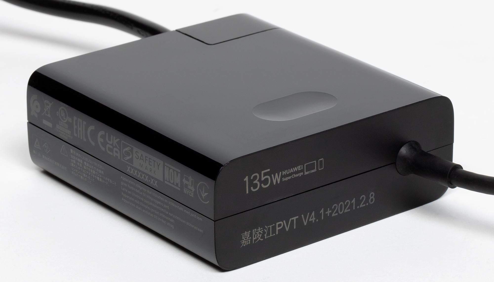 Судя по надписям на нем этот БП выдает до 135 Вт в варианте 20 В на 6,75 А (доступно еще несколько вариантов сочетаний напряжения и максимального тока). Сетевой кабель питания у этого БП отсоединяемый, и при большом желании вместо штатного можно подключить кабель с разъемом типа «восьмерка» (или C7), но защитный контакт при этом уже не будет задействован.