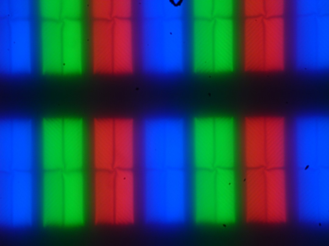Четкое изображение структуры пикселей из-за матовой поверхности получить не удается, впрочем, на фрагменте ниже можно разглядеть типичную для VA структуру в виде параллельных полосок, а также что каждый субпиксель делится на четыре равных домена, в которых полоски ориентированы под разными углами (черные точки — это пыль на матрице фотоаппарата):