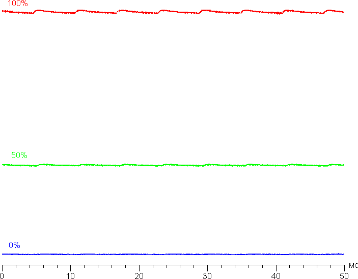На любом уровне яркости модуляция подсветки отсутствует, что исключает видимое мерцание экрана. Для тех, кто привык распознавать знакомое сокращение, уточним: ШИМ отсутствует. В доказательство приведем графики зависимости яркости (вертикальная ось) от времени (горизонтальная ось) при различных значениях настройки яркости: