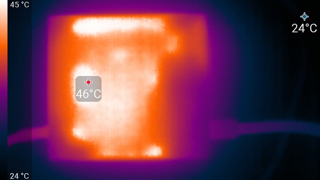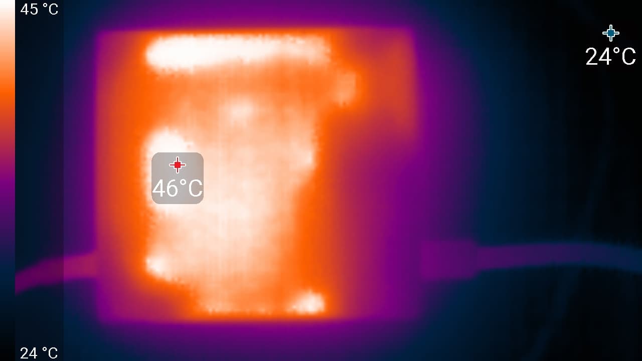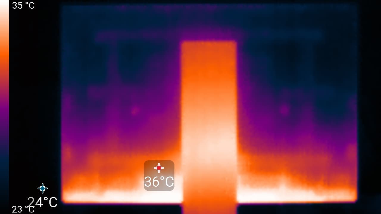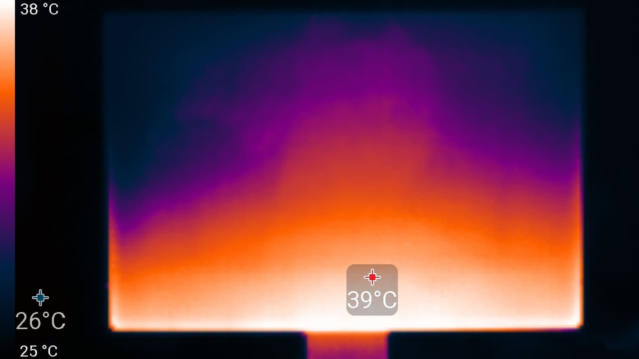 Нижний край экрана нагрелся до 39 °C максимум. Видимо, внизу находится светодиодная линейка подсветки экрана. Нагрев блока питания при этом существенный, и это без потребителя на 65 Вт, который может быть подключен к монитору: