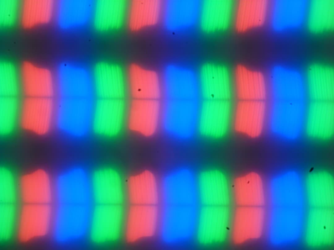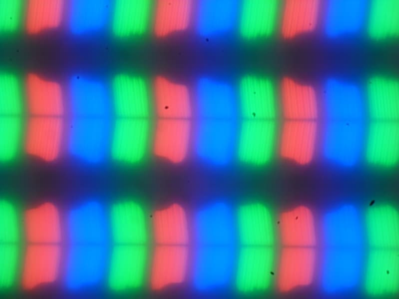 На микрофотографии ниже можно разглядеть типичную для IPS структуру в виде параллельных полосок, а также, что каждый субпиксель делится на два примерно равных домена (черные точки — это пыль на матрице фотоаппарата):