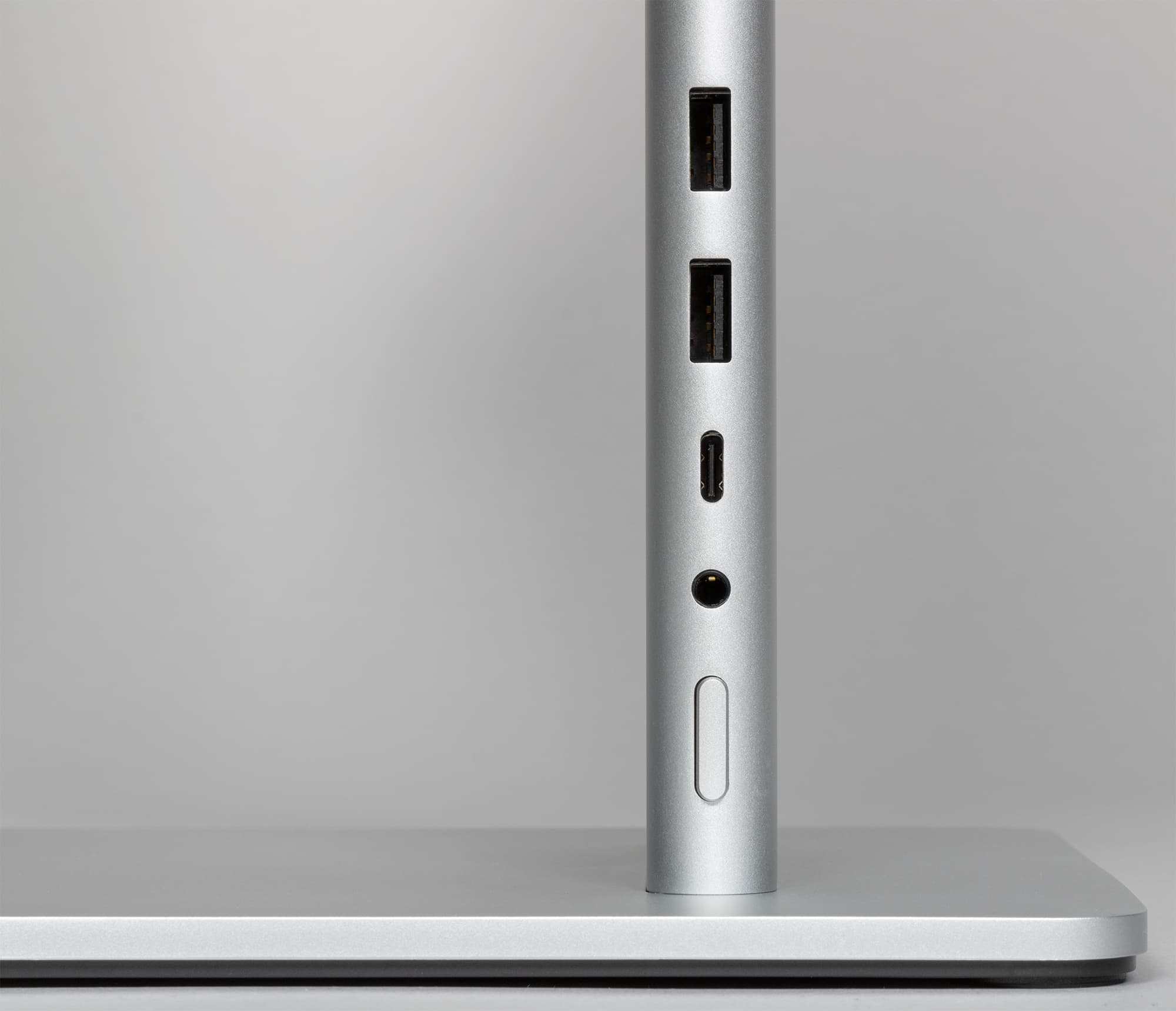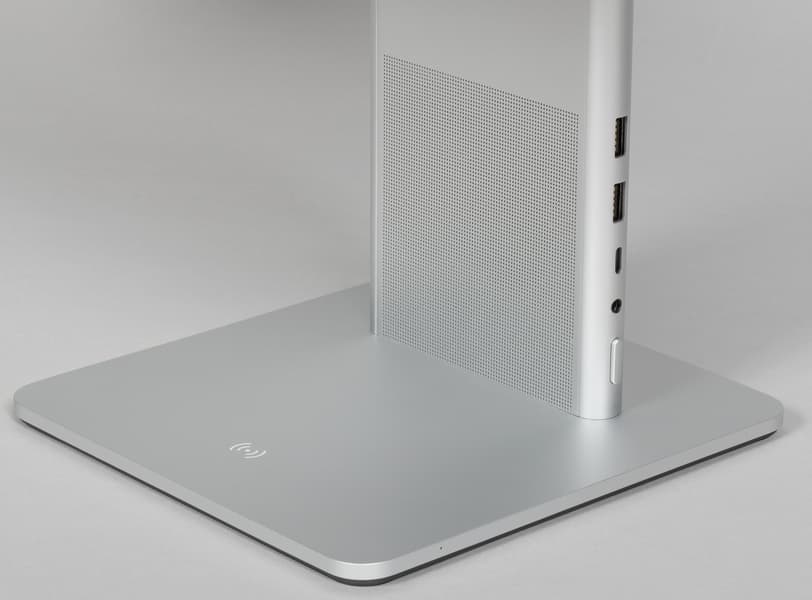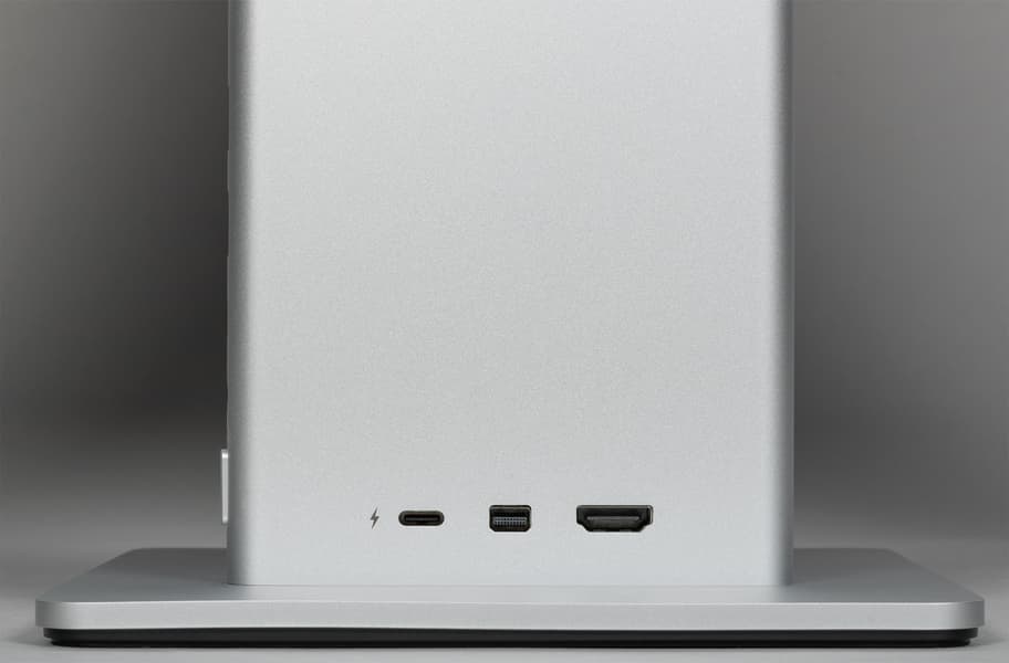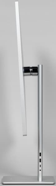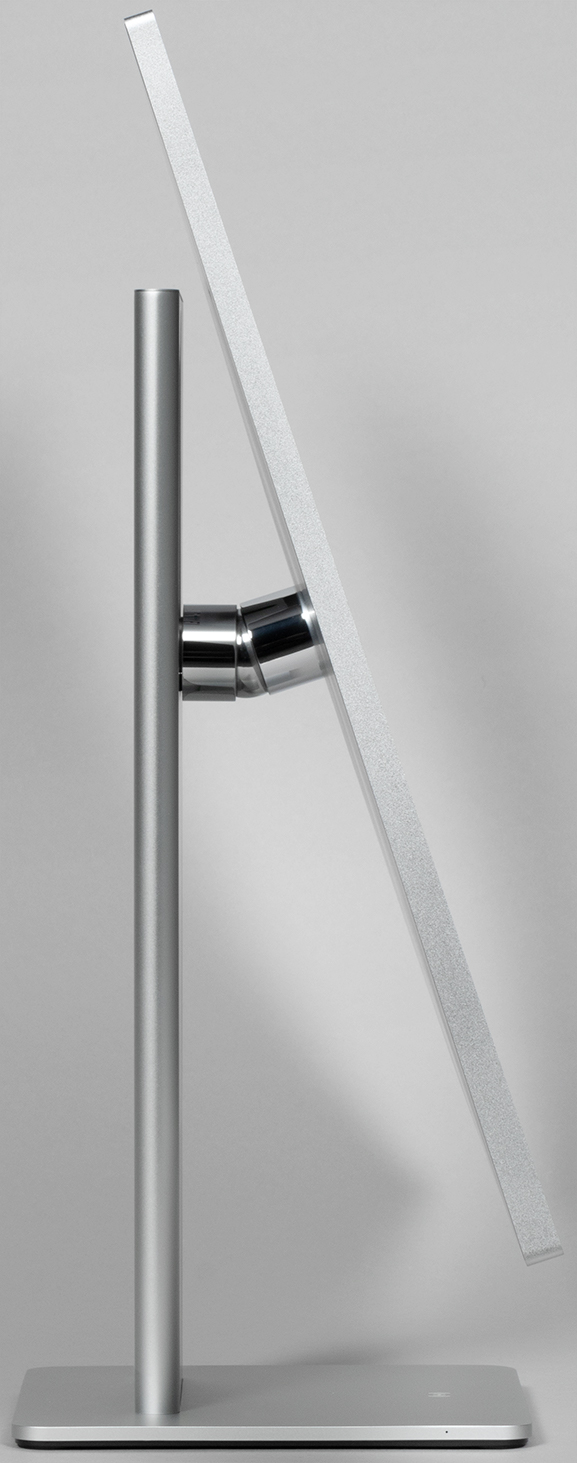 Дизайн монитора стильный, аккуратный и во многом уникальный. Цвет устройства производитель характеризует как «мистический серебристый». Стойка подставки и окантовка блока экрана изготовлены из алюминия с матовой анодированной поверхностью. Кожух сверху на основании подставки и задняя панель блока экрана выполнены из пластика также с матовой серебристой поверхностью. Шарнир, к которому крепится блок экрана, и круглая площадка изготовлены из нержавеющей стали с зеркально-гладкой полированной поверхностью. Низ основания стойки — из черного пластика с матовой поверхностью. Внешняя поверхность матрицы черная, полуматовая. Экран выглядит как монолитная поверхность, ограниченная по периметру узкой окантовкой. Выведя изображение, можно увидеть, что между внешними границами блока экрана и собственно областью отображения есть неширокие поля. Производитель указывает, что от области отображения до внешних краев блока экрана сверху и с боков по 6 мм, что является правдой, а полезная площадь экрана составляет 94%. При этом снизу поле чуть шире — 9,5 мм.