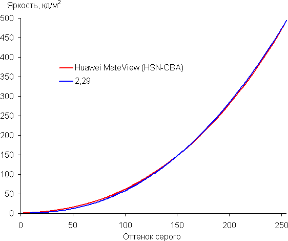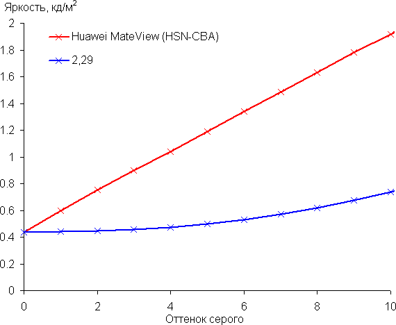Рост прироста яркости достаточно равномерный, и каждый следующий оттенок ярче предыдущего, а в самой темной области даже наблюдается близкий к линейному рост яркости, что отвечает требованиям стандарта sRGB: