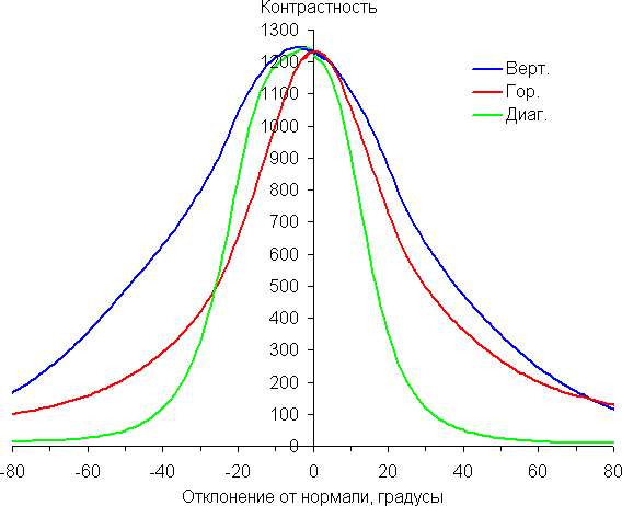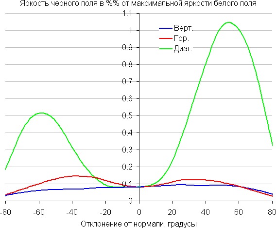 Углы обзора по снижению яркости не очень широкие. При отклонении в диагональном направлении яркость черного поля начинает резко возрастать уже при 20°-30° отклонения от перпендикуляра к экрану. Если сидеть не очень далеко от экрана, то черное поле по углам будет заметно светлее, чем в центре, и иметь красноватый оттенок. Контрастность в диапазоне углов ±82° в случае отклонения по диагонали приближается к отметке 10:1, и опускается ниже при отклонении в одном направлении более чем на 69°.