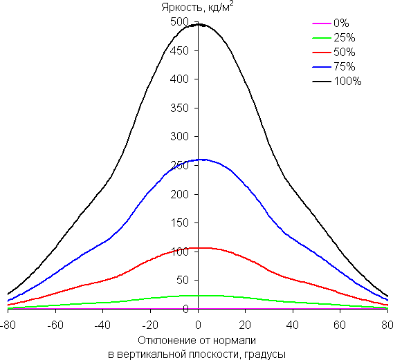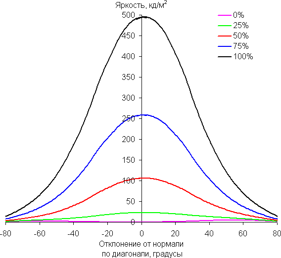 Чтобы выяснить, как меняется яркость экрана при отклонении от перпендикуляра к экрану, мы провели серию измерений яркости черного, белого и оттенков серого в центре экрана в широком диапазоне углов, отклоняя ось датчика в вертикальном, горизонтальном и диагональном (из угла в угол) направлениях.