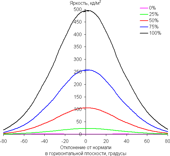 В качестве реперной точки можно выбрать отклонение в 45°, что может быть актуальным в случае, например, если изображение на экране рассматривают два человека одновременно. Критерием сохранения правильности цветов можно считать значение ΔE меньше 3. Стабильность цветов в целом хорошая (хотя бывает и лучше), это является одним из главных достоинств матрицы типа IPS.