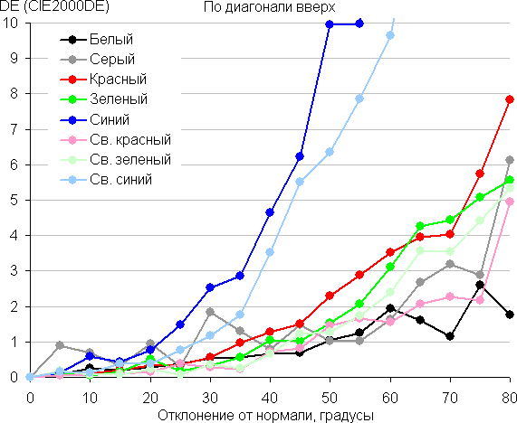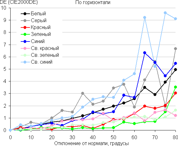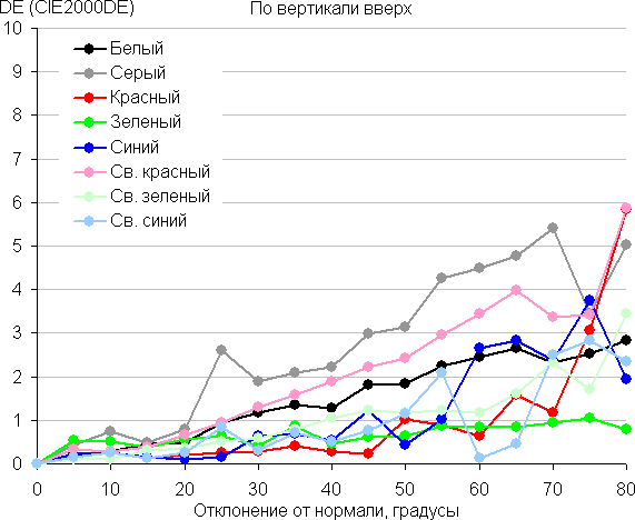 Для количественной характеристики изменения цветопередачи мы провели колориметрические измерения для белого, серого (127, 127, 127), красного, зеленого и синего, а также светло-красного, светло-зеленого и светло-синего полей во весь экран с использованием установки, подобной той, что применялась в предыдущем тесте. Измерения проводились в диапазоне углов от 0° (датчик направлен перпендикулярно к экрану) до 80° с шагом в 5°. Полученные значения интенсивностей были пересчитаны в ΔE относительно замера каждого поля при перпендикулярном положении датчика относительно экрана. Результаты представлены ниже: