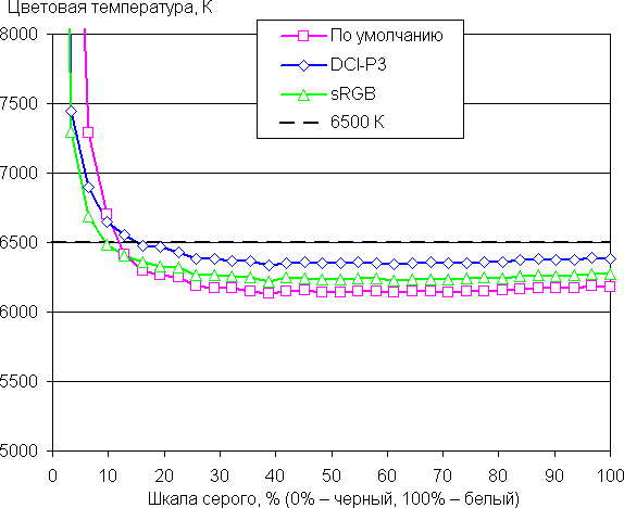 Цветовой баланс во всех трех встроенных профилях достаточно хороший, так как цветовая температура достаточно близка к стандартным 6500 К, и отклонение от спектра абсолютно черного тела (параметр ΔE) гораздо меньше 10 единиц, что для потребительского устройства считается очень хорошим показателем. При этом оба параметра мало изменяются на различных участках шкалы серого, что улучшает визуальное восприятие цветового баланса. Графики ниже показывают цветовую температуру на различных участках шкалы серого и отклонение от спектра абсолютно черного тела (параметр ΔE) в случае трех профилей: