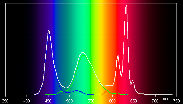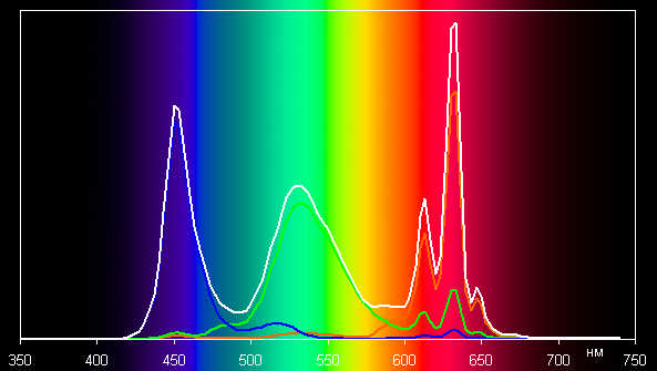 Спектры основных цветов очень хорошо разделены, что и обуславливает широкий цветовой охват. Небольшое перекрестное подмешивание вызвано, видимо, неидеальным разделением с помощью светофильтров. Можно предположить, что в светодиодах подсветки применяется синий излучатель и зеленый и красный люминофоры, при этом в люминофорах, по всей видимости, используются так называемые квантовые точки. В случае профиля sRGB с корректировкой цветового охвата компоненты уже подмешиваются друг к другу в значительной степени: