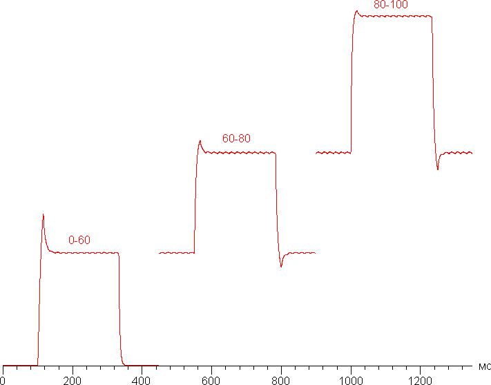 Время отклика при переходе черный-белый-черный равно 15 мс (7,5 мс вкл. + 7,5 мс выкл.), переход между полутонами серого в сумме (от оттенка к оттенку и обратно) в среднем занимает 14 мс. Матрица весьма быстрая, что обусловлено наличием небольшого разгона. На графиках некоторых переходов есть характерные всплески яркости, например, так выглядят графики для переходов между оттенками 0% и 60%, 60% и 80%, 80% и 100% (по вертикали — яркость, по горизонтали — время, для наглядности графики выстроены последовательно):