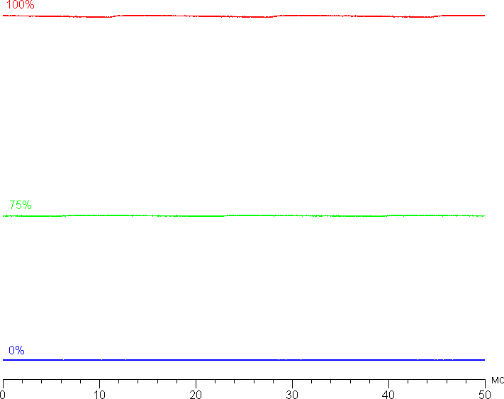 На любом уровне яркости значимая модуляция подсветки отсутствует, что исключает видимое мерцание экрана. Для тех, кто привык распознавать знакомое сокращение, уточним: ШИМ отсутствует. В доказательство приведем графики зависимости яркости (вертикальная ось) от времени (горизонтальная ось) при различных значениях настройки яркости: