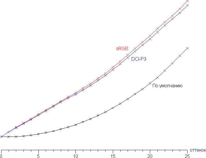 Самый близкий к черному диапазон можно не учитывать, так как в нем цветопередача не так важна, а погрешность измерения цветовых характеристик высокая. В принципе, в большинстве случаев и даже для ответственной работы с графикой будет достаточно выбрать профиль sRGB или DCI-P3. Как вариант также можно оставить профиль По умолчанию и использовать систему управления цветом, предварительно охарактеризовав монитор, создав его цветовой профиль.