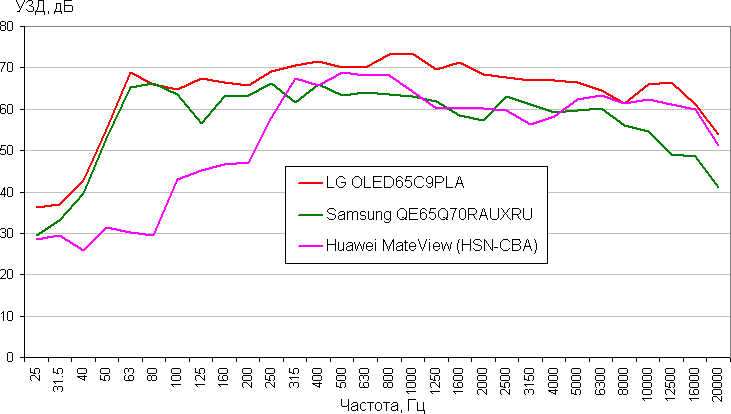 Сравним АЧХ этого монитора с АЧХ двух телевизоров высшего класса (воспроизводился розовый шум, уровни звукового давления в 1/3 октавах записывал шумомер Октава-110А-Эко, 30 дБ — это примерно фоновый уровень шума):