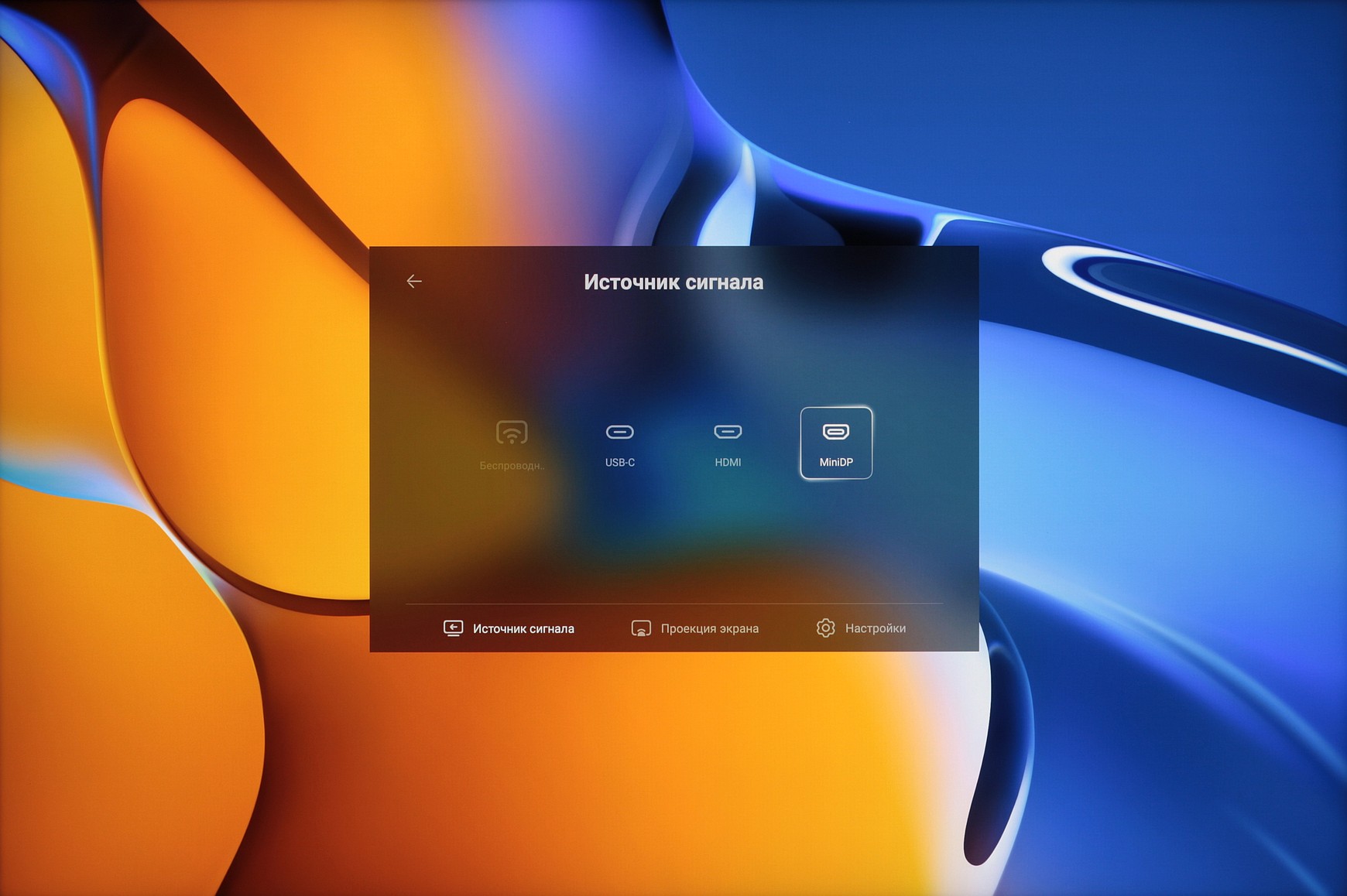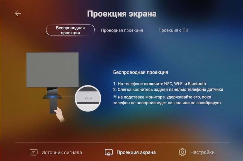 Монитор поддерживает беспроводной прием изображения и звука по технологии Miracast. Подключение мобильного устройства (смартфона или планшета) или ПК с адаптером Wi-Fi (стационарного или ноутбука) в общем-то стандартное и описания не заслуживает. В случае некоторых смартфонов Huawei поддерживается запуск беспроводной проекции в одно касание — функция OneHop. Достаточно смартфон поднести к основанию подставки, и проекция запустится: