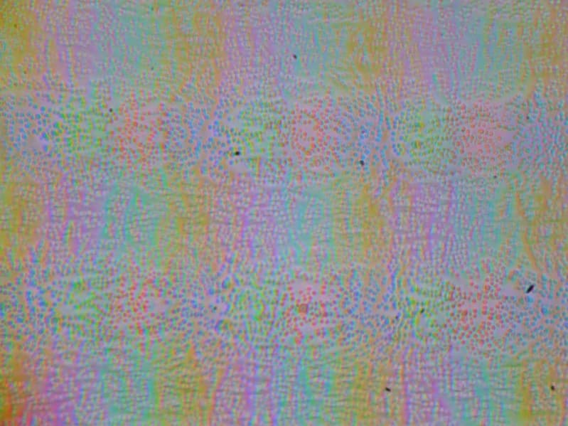Зерно этих дефектов в несколько раз меньше размеров субпикселей (масштаб этих двух фотографий примерно одинаковый), поэтому фокусировка на микродефектах и «перескок» фокуса по субпикселям при изменении угла зрения выражены слабо, из-за этого нет и «кристаллического» эффекта.