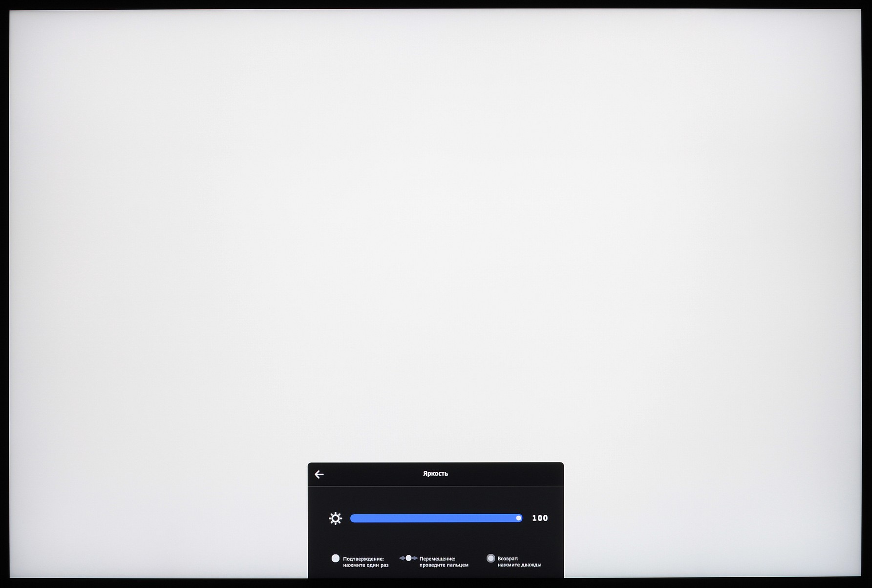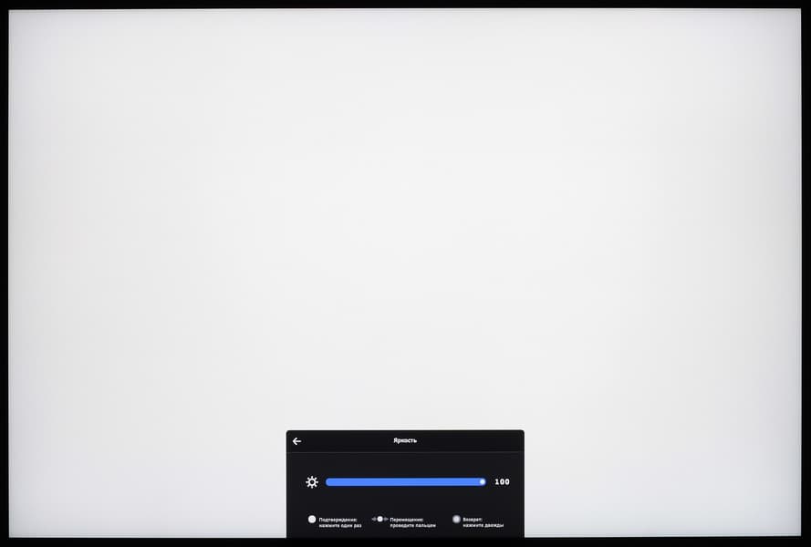 Когда монитор включен и на экране нет меню, то перемещение одного пальца по сенсорной полоске регулирует громкость, перемещение двух пальцев — выводит меню выбора входа и перемещает выделение на значке входа (но для переключения на вход нужно подтверждение однократным нажатием). Однократное нажатие на полоску выводит меню установок. Далее в нем: перемещение одного пальца меняет выделение пункта меню или значение параметра, однократное нажатие — выбор выделенного пункта меню, двукратное нажатие — возврат на предыдущий уровень. Отметим, что работа с сенсорной полоской осложняется тем, что перемещения по ней и нажатия далеко не всегда срабатывают. Также бывает, что полоска просто перестает работать, что исправляется выключением монитора и включением. В целом из-за этих моментов настраивать монитор очень неудобно.