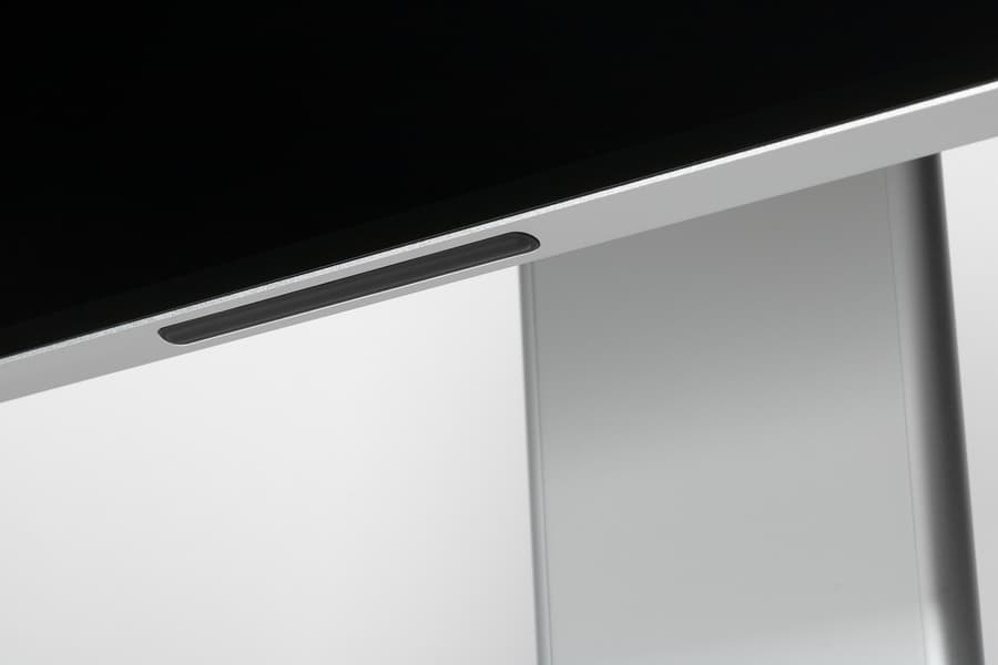 В нижней части стойки есть решетка, за которой расположены два громкоговорителя. Разглядеть их за решеткой невозможно, поэтому поверим производителю, что их там два. На правом и на левом торцах основания стойки ближе к переднему краю можно обнаружить по одному отверстию встроенного сдвоенного микрофона.